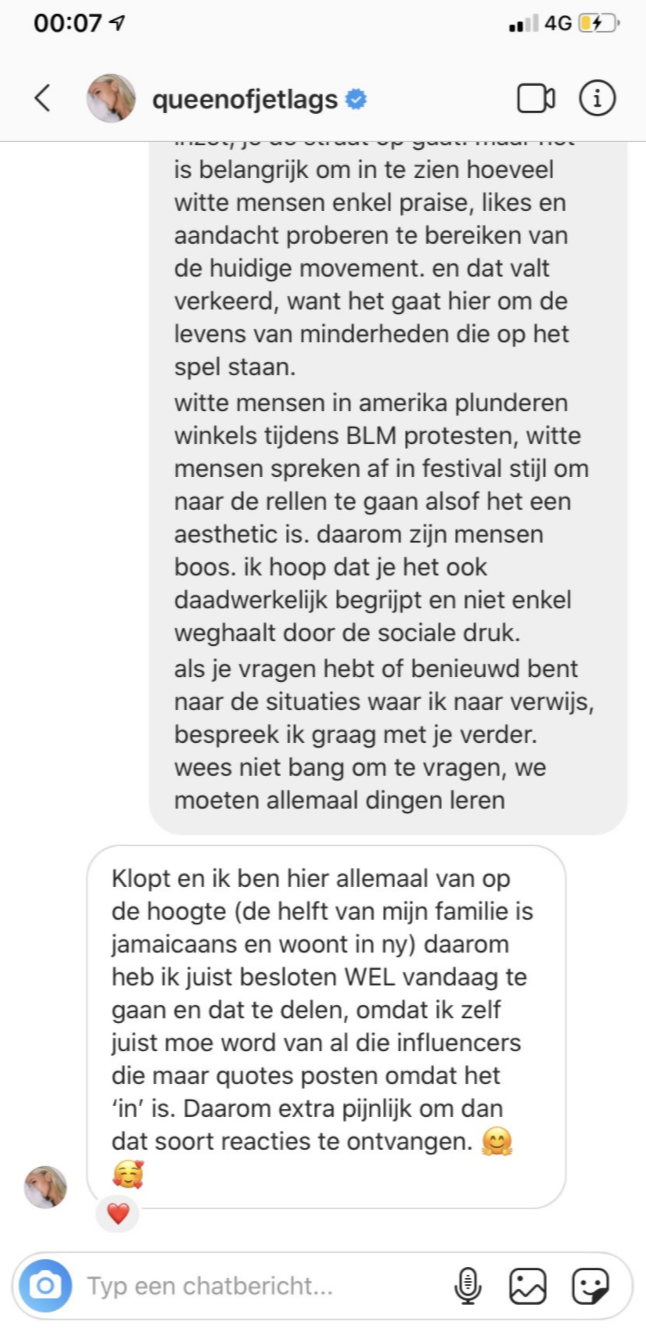 Vandaag is het Black Out Tuesday, een dag waar iedereen stilstaat bij racisme en letterlijk op zwart gaat op social media. Gisteren is er een groot statement gemaakt op de Dam in Amsterdam. Mensen zijn gaan demonstreren en willen luid en duidelijk gehoord worden. Bekende inlfuencer Queen of Jetlags stond ook te demonstreren op de Dam, maar haar Instagrampost erover viel niet helemaal in goede aarde.