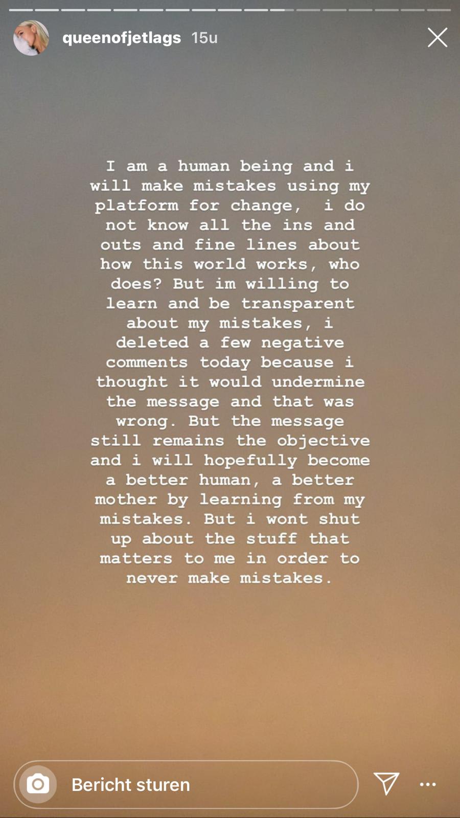 8. Queen of Jetlags verwijdert haar foto van Instagram en plaatst stories over hoe ze zich voelt bij de reacties.