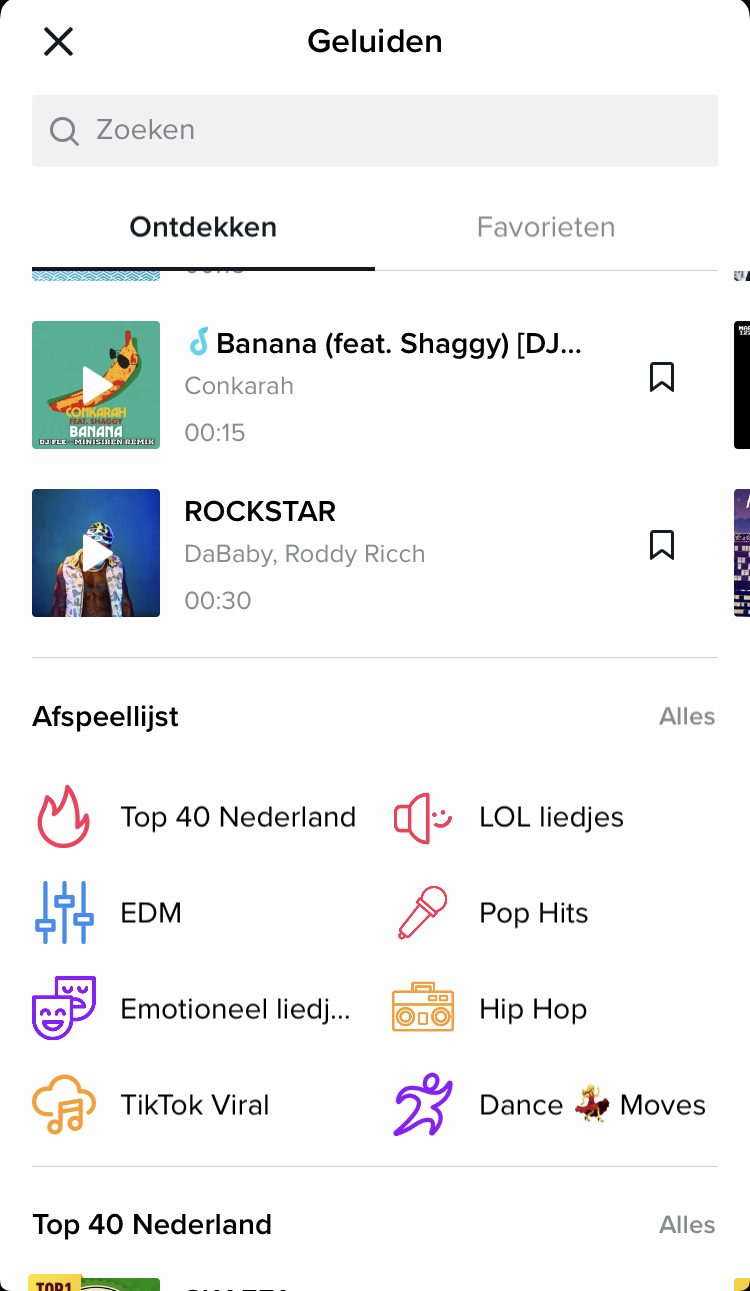 Je kunt zien welk liedje populair is op TikTok door bij het scherm van het opnemen van een video op ‘geluiden’ te klikken. Vervolgens op ‘TikTok-viral’.