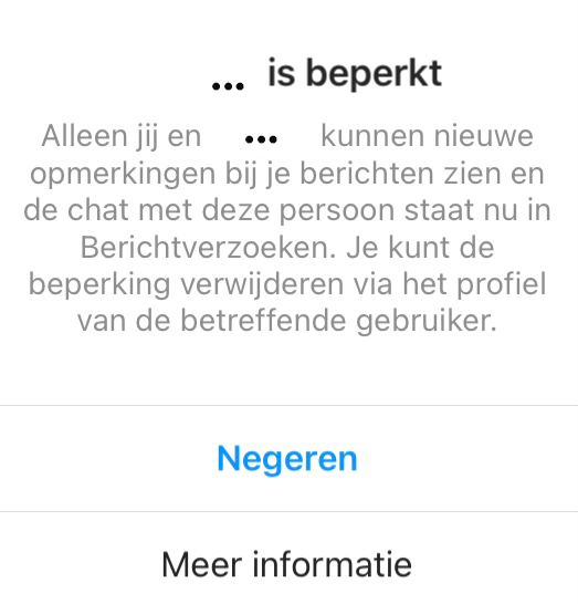 3. Beperken is eigenlijk hetzelfde als ontvolgen, maar dan zonder dat degene het doorheeft. Dit doe je op dezelfde plek als blokkeren, alleen klik je dan op ‘beperken’. Je ziet dan geen posts meer van diegene in je tijdlijn en je kunt ook zijn of haar stories uitzetten.