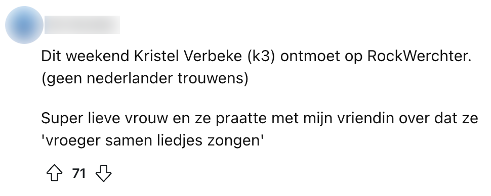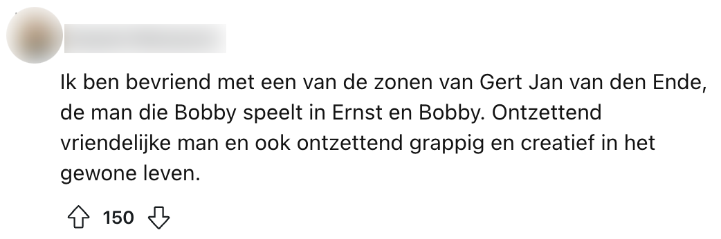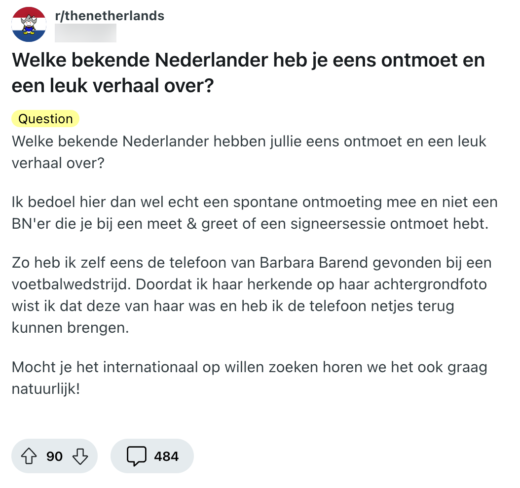 Omdat bekende Nederlanders ook maar gewoon mensen zijn, reageert iedereen anders wanneer ze er eentje in het wild spotten. Terwijl Ans tweeduizend selfies wil, vraagt Younes om een handtekening, en Joop gaat liever een ‘staring contest’ aan. Eén ding is zeker: na zo’n ontmoeting heb je tenminste wel wat te vertellen op de kringverjaardag van je tante. Om deze reden is een Reddit-gebruiker wel benieuwd naar spontane ontmoetingen met BN’ers. U vraagt, Nederlanders draaien.