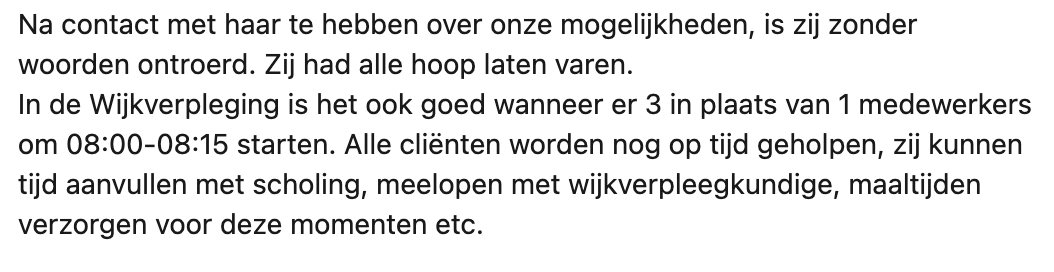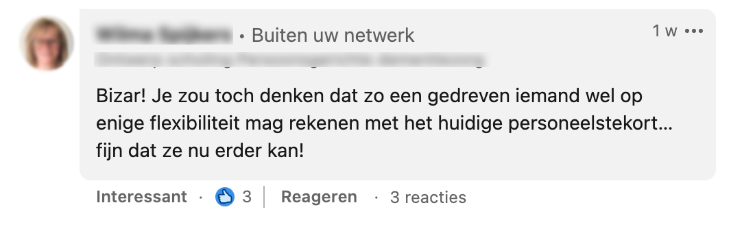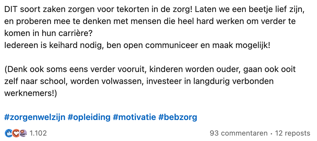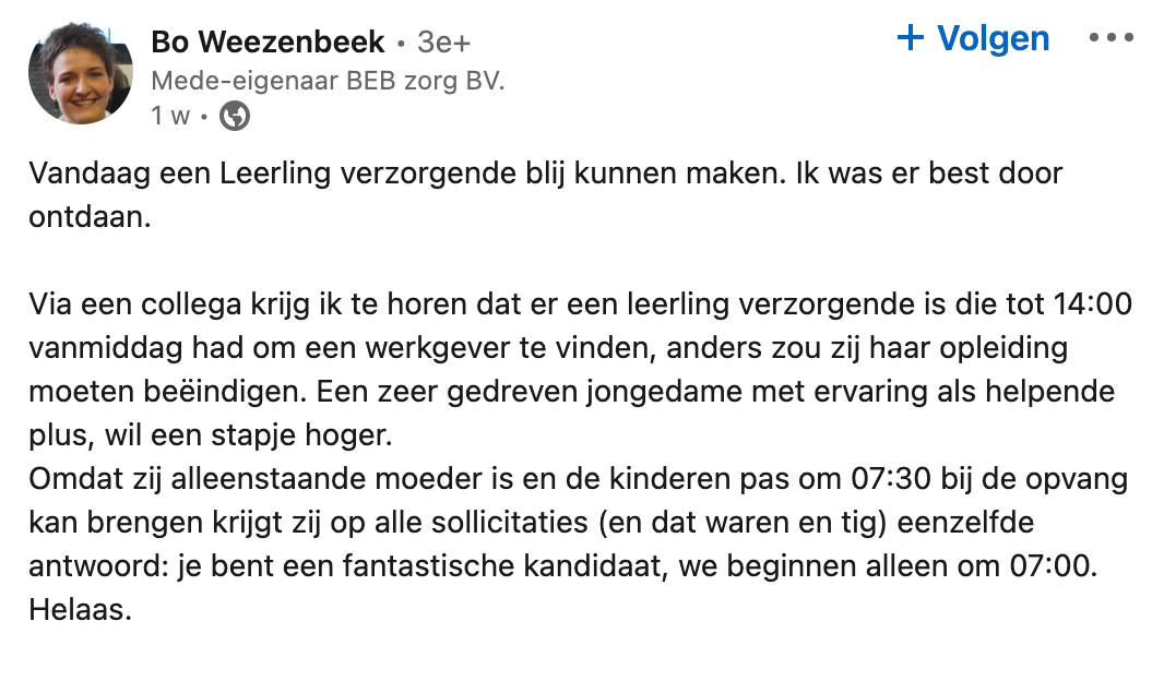Helaas werken er nog steeds te weinig mensen in de zorg. Ondanks het grote personeelstekort, is het niet altijd even makkelijk om een baan te vinden in de zorg. Zo moest een alleenstaande moeder bijna haar opleiding stoppen, omdat ze geen baan kon vinden waarbij ze om 07.30 mocht beginnen, zodat ze van tevoren haar kinderen naar de opvang kon brengen. Maar gelukkig was daar Bo, die begon met schuiven en plek wist te maken voor de persoon in kwestie. Ze deelt het verhaal op LinkedIn, met de boodschap dat we lief voor elkaar moeten blijven en mee moeten denken om zo sommige mensen verder te kunnen helpen in hun carrière. Dat leidde tot een mooi gesprek.