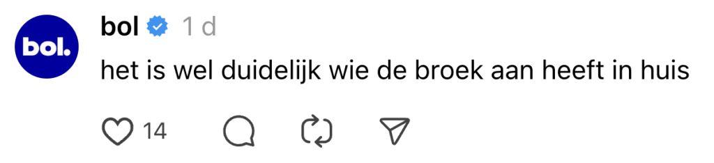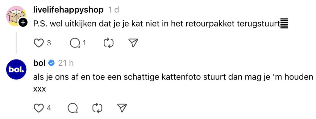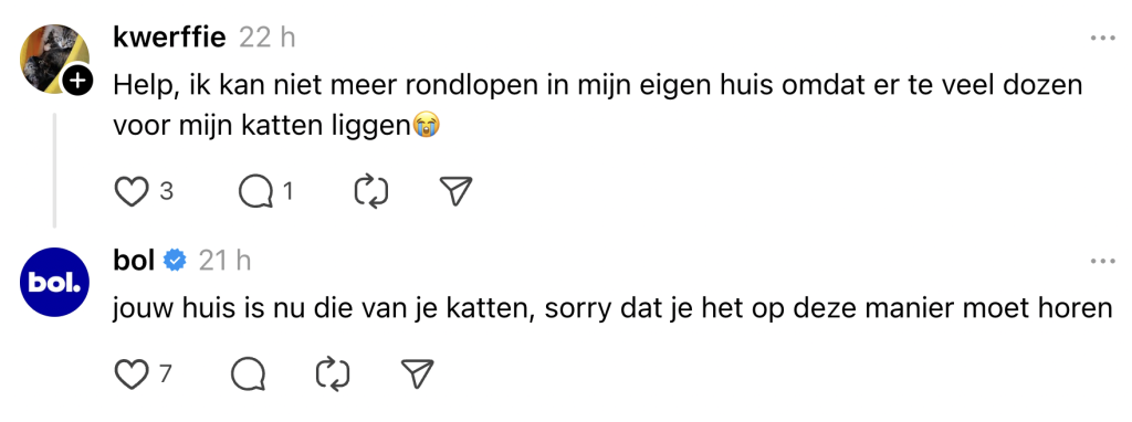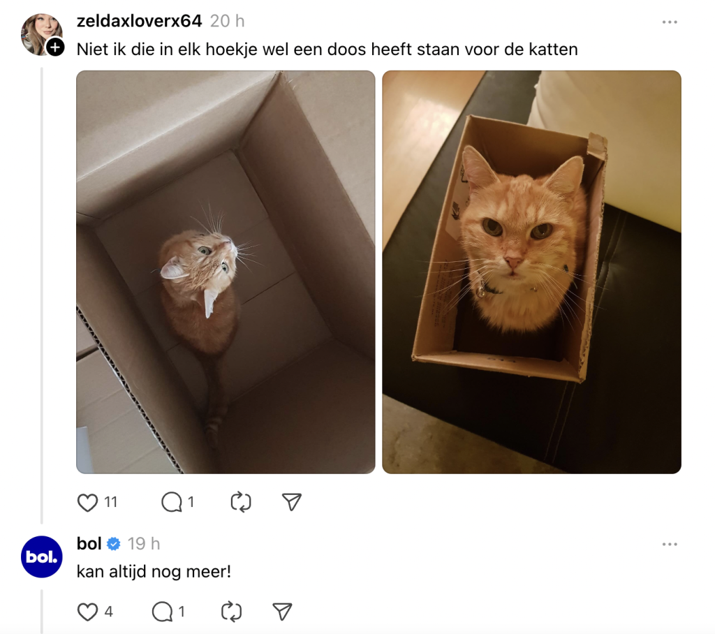 Als je een pakketje verwacht, kun je haast niet wachten tot de bezorger bij je aanbelt. Starend uit het raam en bang om naar de wc te gaan en je pakketje mis te lopen, wacht je met smart op die prachtige Dyson stofzuiger. Als het apparaat dan eindelijk zijn entree maakt in je woonkamer, heb je natuurlijk geen oog meer voor de doos waar-ie inzat. Maar in plaats van hem meteen weg te flikkeren, kun je er waarschijnlijk een huisgenoot erg blij mee maken. En bol wil dit graag nog even extra benadrukken met deze bijzondere opmerking op Threads…