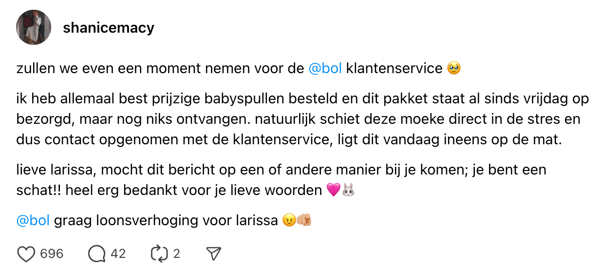 Je geduld wordt enorm op de proef gesteld wanneer je op een pakketje wacht. Je blijft maar je e-mail verversen, hopend op een update van een bezorgservice over de aankomst van je bestelling. Voor Shanice voelde het wachten eindeloos, dus besloot ze contact op te nemen met de klantenservice van bol. Wat ze niet had verwacht, was wat ze daarvoor terug zou krijgen.