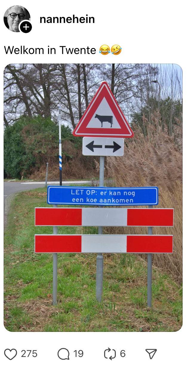 Waar je in de Randstad bij het oversteken moet oppassen dat een horde fietsers je niet van je sokken rijdt, is dat op het platteland wel het laatste waar men bij stilstaat. Daar kun je rustig drie uur doen over het oversteken van een straat en nog geen hond voorbij zien komen. Omgekeerde wereld, hè? Toch is het ook hier belangrijk dat bij elke verkeerssituatie een passend verkeersbord staat, eventueel met een extra waarschuwing voor weggebruikers. Zo is het bord dat Nanne in Twente spot toch wel héél andere koe(k).