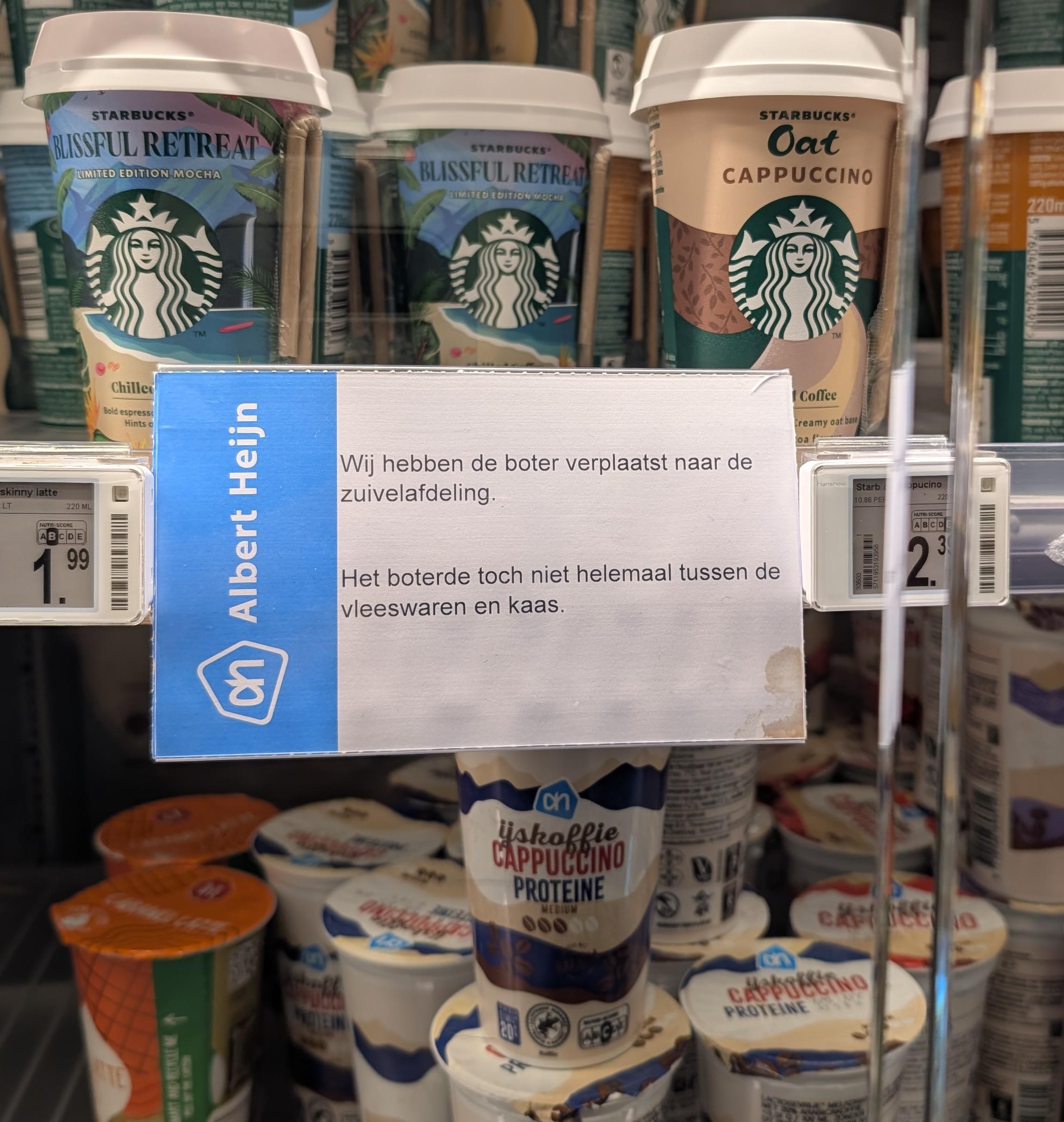 Zo nu en dan verplaatsen supermarkten producten naar een ander gangpad, of gooien ze de hele indeling van de winkel om. Vervolgens sta je je als klant een uur lang af te vragen waar ze de $%ˆ#G$ boter nu weer hebben neergelegd. Om onnodige frustratie te voorkomen, hangt een Albert Heijn-filiaal een bordje bij het voormalige boterschap, met daarop een mededeling die net zo smooth is als een gemiddeld pakje roomboter.