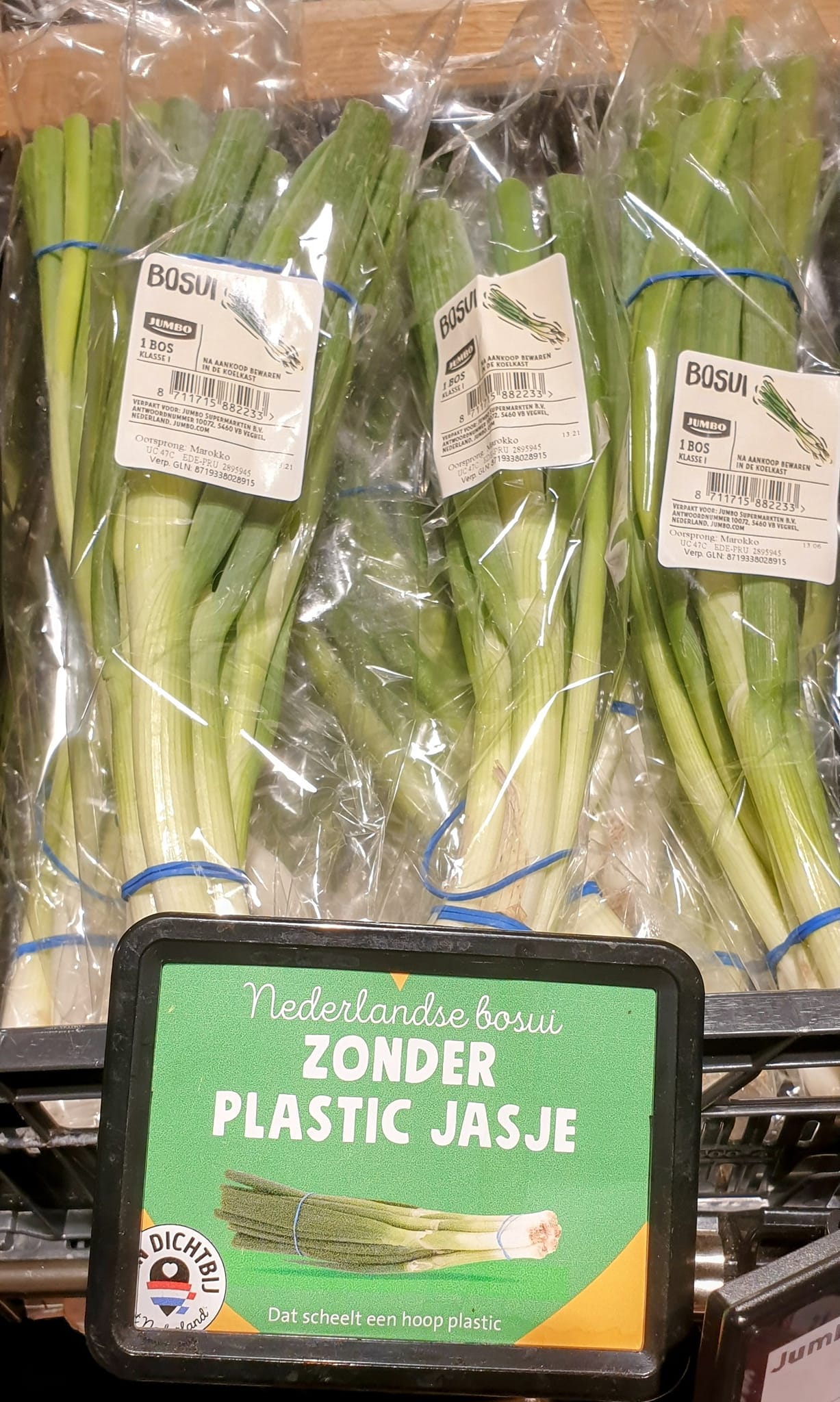 Hoewel klanten in een supermarkt altijd perfect opgepoetste groenten willen zien die geen millimeter te krom zijn mogen zijn, gaat er bij supermarkten nog weleens iets mis. Zo heeft Jumbo netjes een levering bosuien in het schap gelegd, maar ziet de supermarkt hun eigen bordje een beetje over het hoofd.