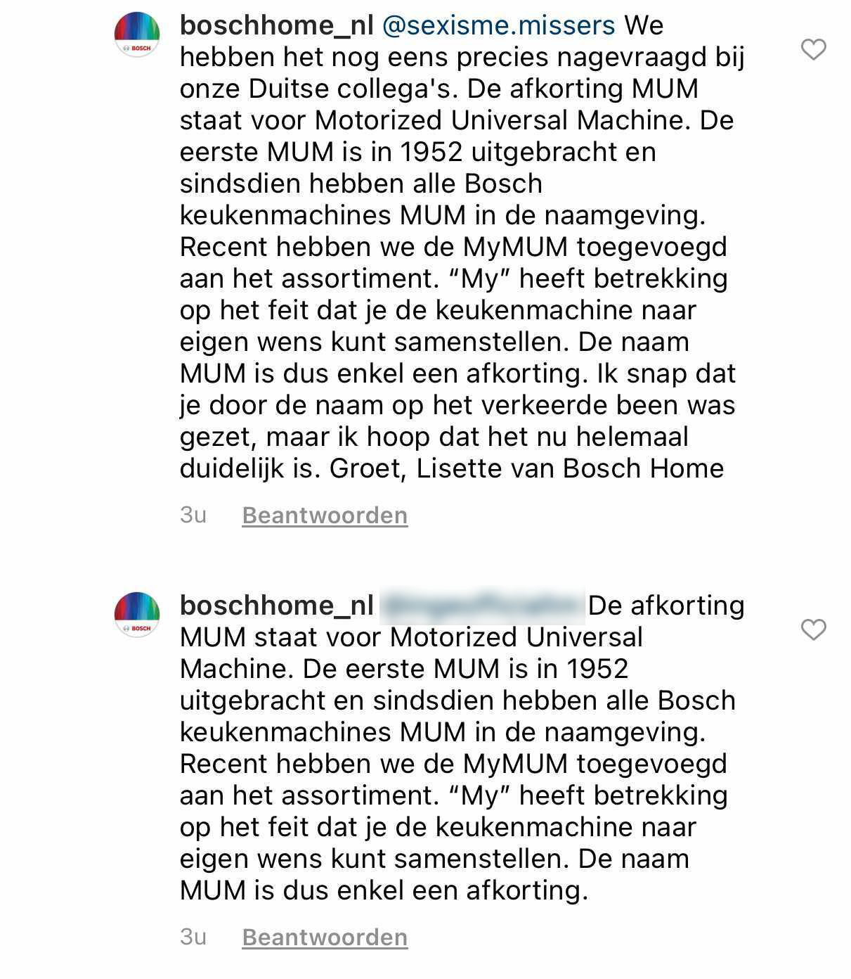 3. Bosch zelf reageert ook onder het bericht met een uitleg.