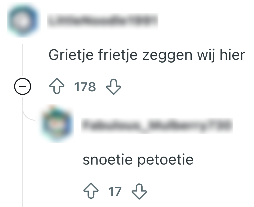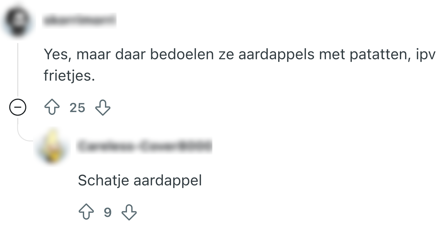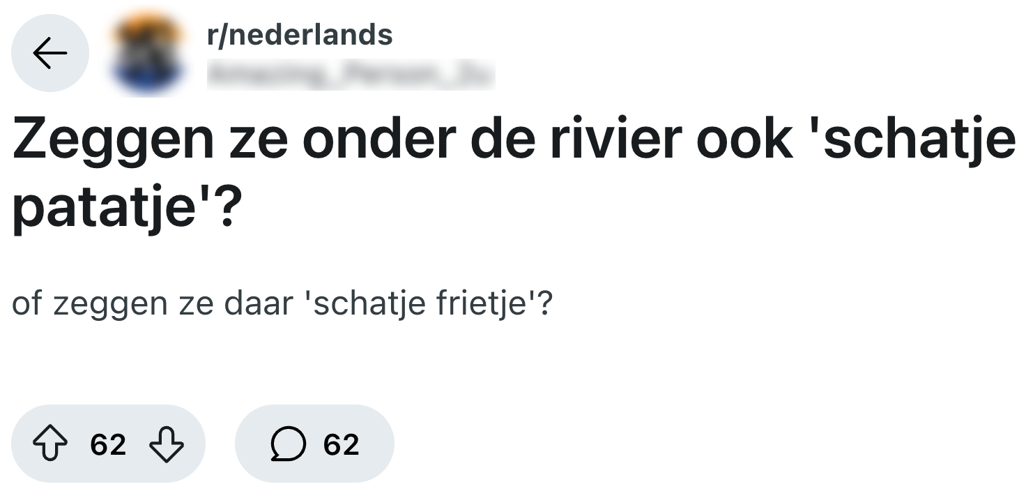 Dat er aanzienlijke verschillen bestaan tussen de mensen boven en onder de rivieren, is allang duidelijk. Onder de rivieren wordt fanatiek carnaval gevierd, terwijl boven de rivieren dat fanatisme een stuk minder groot is. Boven de rivieren is de zachte ‘G’ bijna onvindbaar, maar onder de rivieren is die kei-normaal. Om nog maar te zwijgen over de friet- en patatdiscussie. Over dat laatste heeft een redditor (van boven de rivieren) een vraag voor ondersloters: wordt dít patat-koosnaampje daar ook gebruikt?