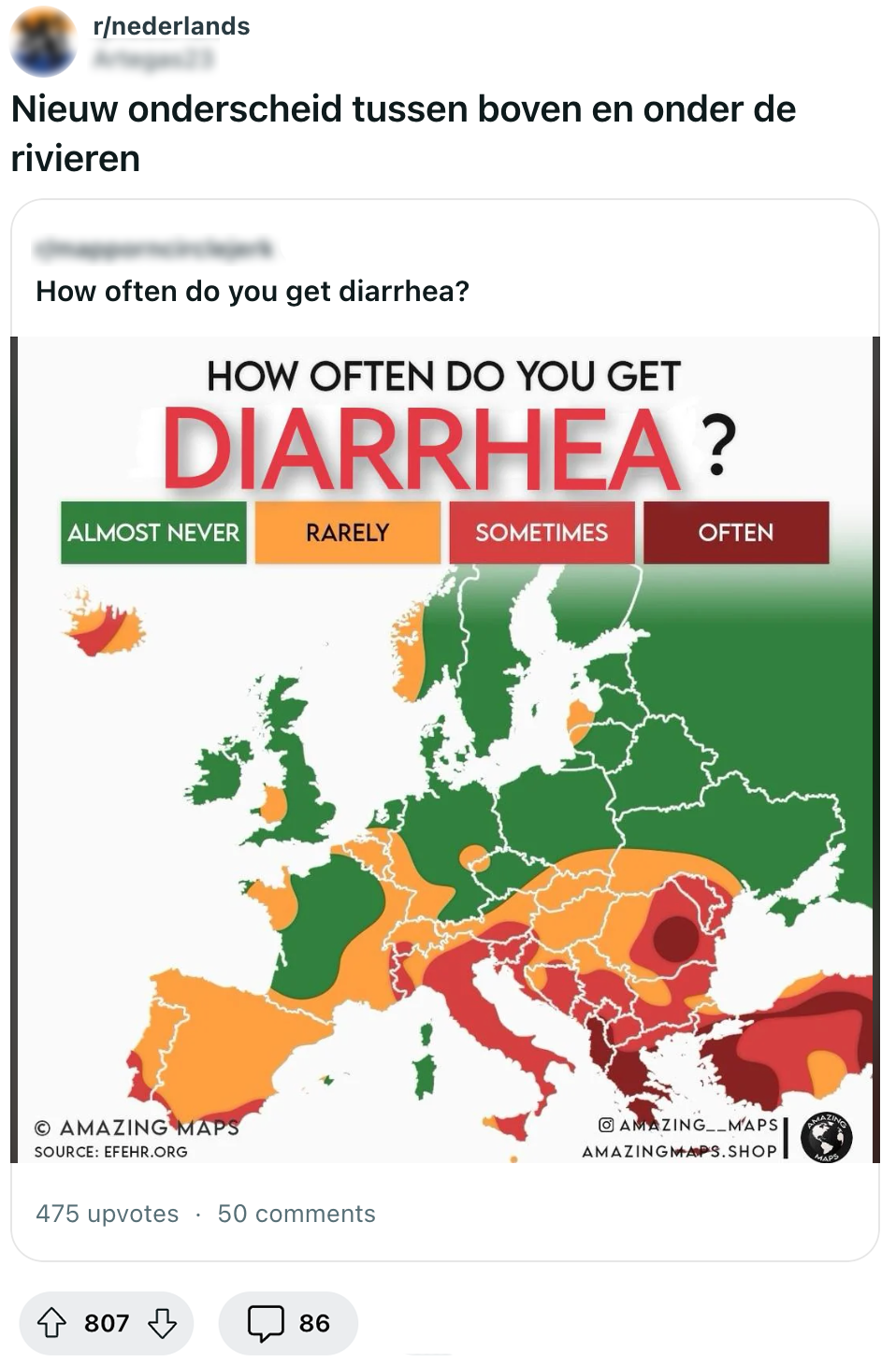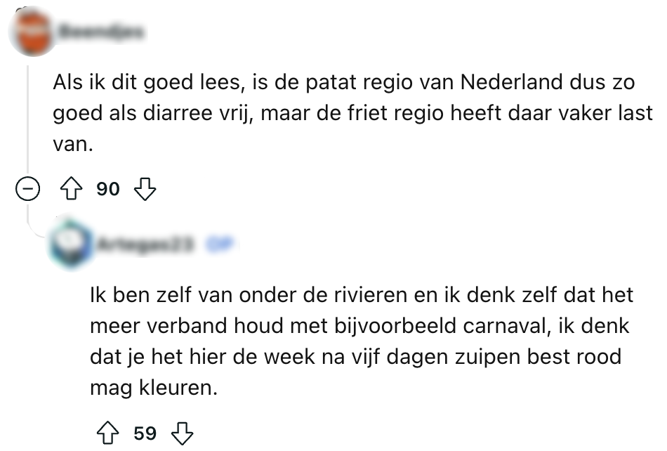 In Nederland is er een duidelijke scheidingslijn, bekend als de rivieren. Daarboven drinken Nederlanders havercappu’s en matcha latte’s, rijden bakfietsmoeders zo nu en dan over je tenen, en noemen ze die goudgele stengels ‘patat’. Daaronder wordt carnaval gevierd, spreken mensen met een onverstaanbaar dialect, en noemen ze die goudgele stengels ‘friet’. Het verschil is overduidelijk. Vanaf vandaag wordt daar volgens Reddit nóg een verschil aan toegevoegd, en dat onderscheid (of moeten we zeggen ‘onderschijt’) wordt online flink te kakken gezet.