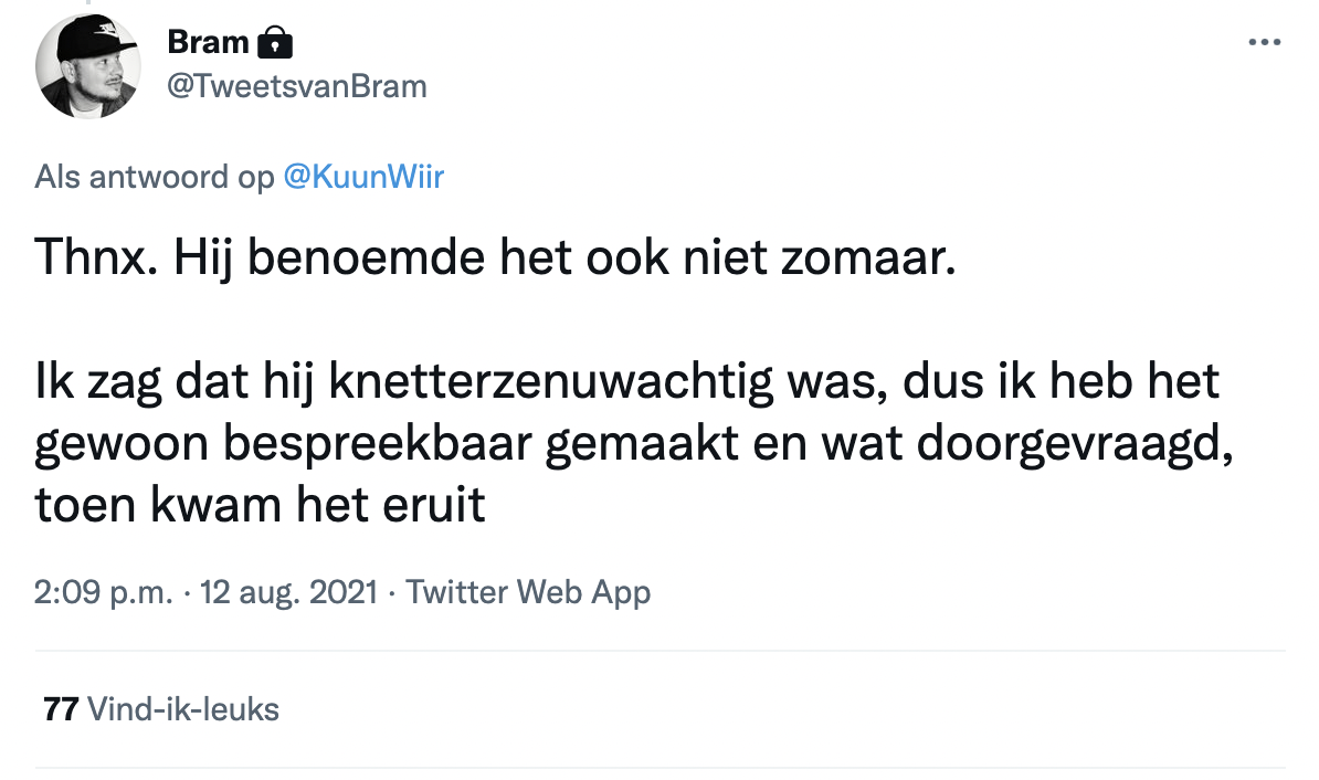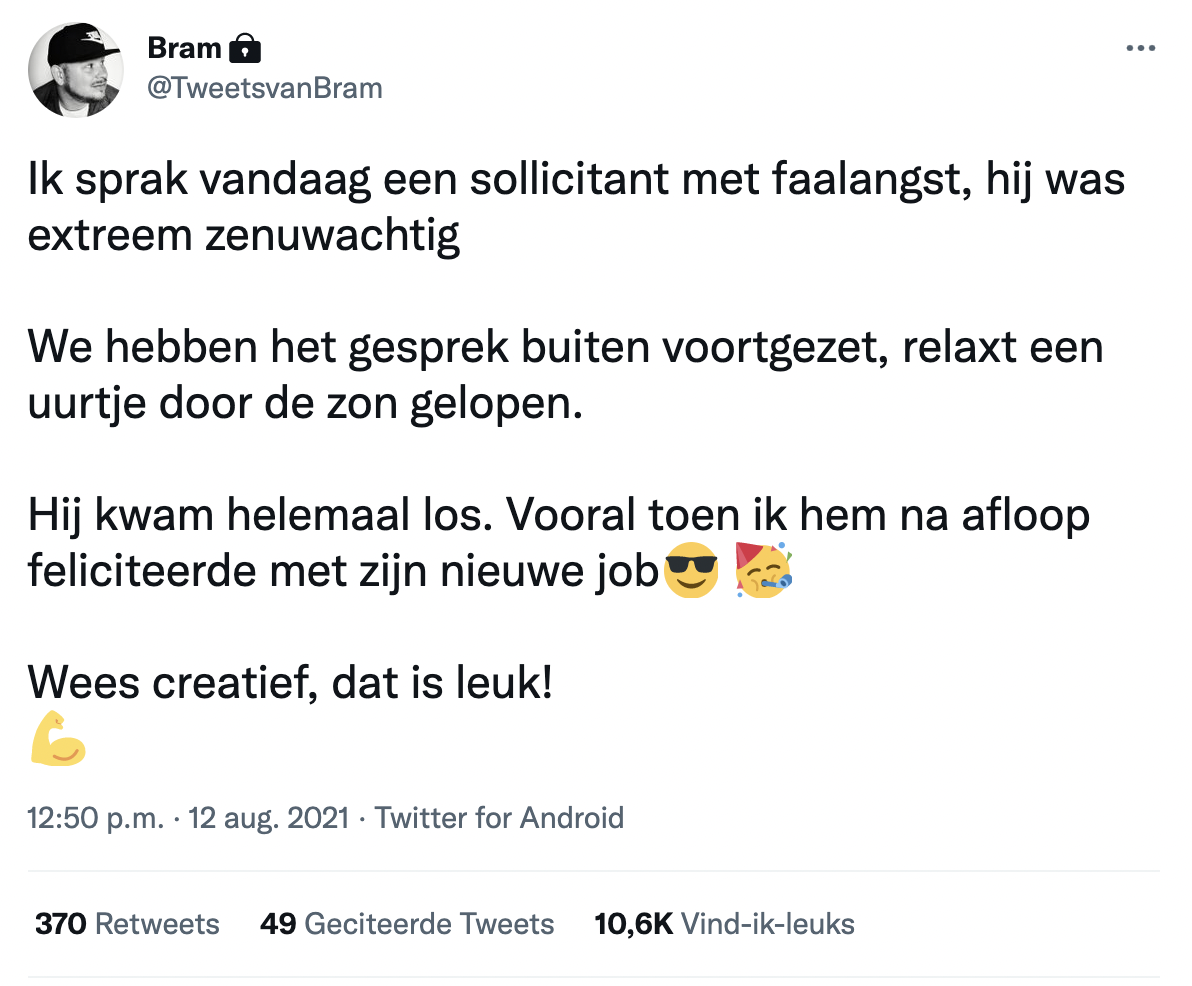 Het kan al best spannend zijn: een sollicitatiegesprek. Je zet je beste beentje voor om indruk te maken bij je (hopelijk) toekomstige werkgever en zo die felbegeerde baan in de wacht te slepen. Maar, voor mensen met faalangst kan dit nog een behoorlijk stukje lastiger zijn. Bram had laatst een sollicitatiegesprek met een potentiële nieuwe werknemer en merkte dat hij hier last van had. In plaats van de sollicitant hierop af te rekenen, besluit Bram op een super manier de sollicitant uit z’n schulp te laten kruipen.