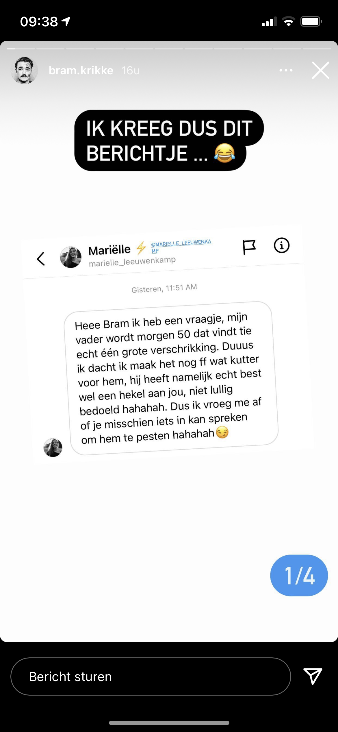 1. Het begon met dit berichtje dat Bram kreeg van Mariëlle. Hij deelde het in z’n story.