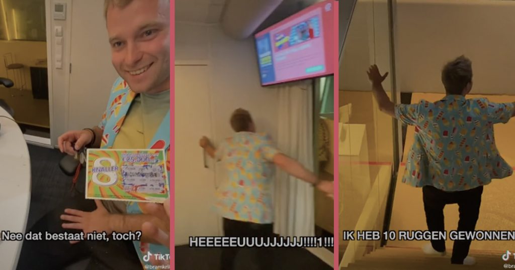 1. Onlangs plaatste Bram deze video op TikTok. Tom, de collega van Bram, sprong een gat in de lucht na het krassen van z’n lot.