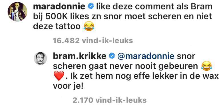 Bram Krikke plaatste afgelopen vrijdag een onschuldige foto op zijn Instagram. Of nouja, onschuldig… hij deed alsof hij een tattoo had van een wel heel bijzonder plaatje. Hij daagde zijn volgers uit om de post 500.000 likes te geven, en als dit zou lukken, zou hij de tattoo echt laten zetten. Dat leek een onmogelijke opgave. Maar dat is een béétje uit de hand gelopen en Bram heeft dit aantal al binnen 2 dagen gehaald.