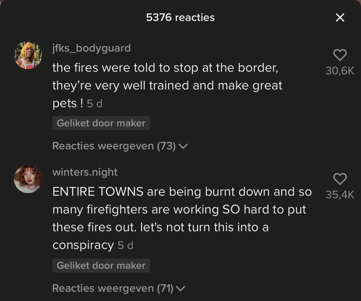 Een TikTok’er denkt dat de branden van tevoren zijn gepland, omdat er amper over de oorzaken wordt gesproken. Ook denkt ze dat de branden ‘weten wanneer ze moeten stoppen’ omdat ze volgens haar precies tot de grens van Canada lopen.