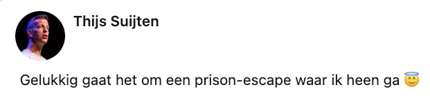 Het ergste wat je vroeger kon gebeuren, was het trekken van het gevangenis-kaartje tijdens een potje Monopoly.  Ook als volwassene word je er toch niet heel blij van als er een brief op de mat valt met de mededeling dat je een straf uit moet zitten. Tot grote schrik van zijn vrouw kreeg Thijs ineens zo’n brief thuisgestuurd. Gelukkig had hij een bijzondere manier om aan de straf te ontsnappen…