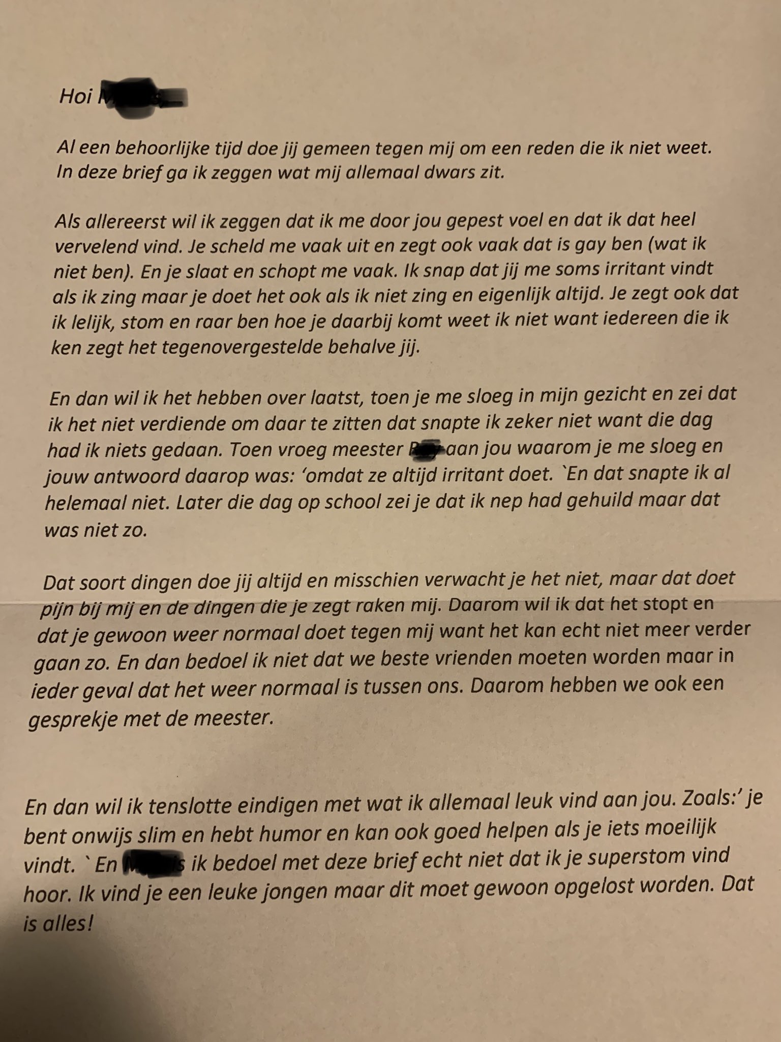 Mijn 12-jarige dochter schreef een kwetsbare brief die ze morgen voorleest aan haar klasgenootje, in het bijzijn van de meester die ze beiden vroeg een brief te schrijven.