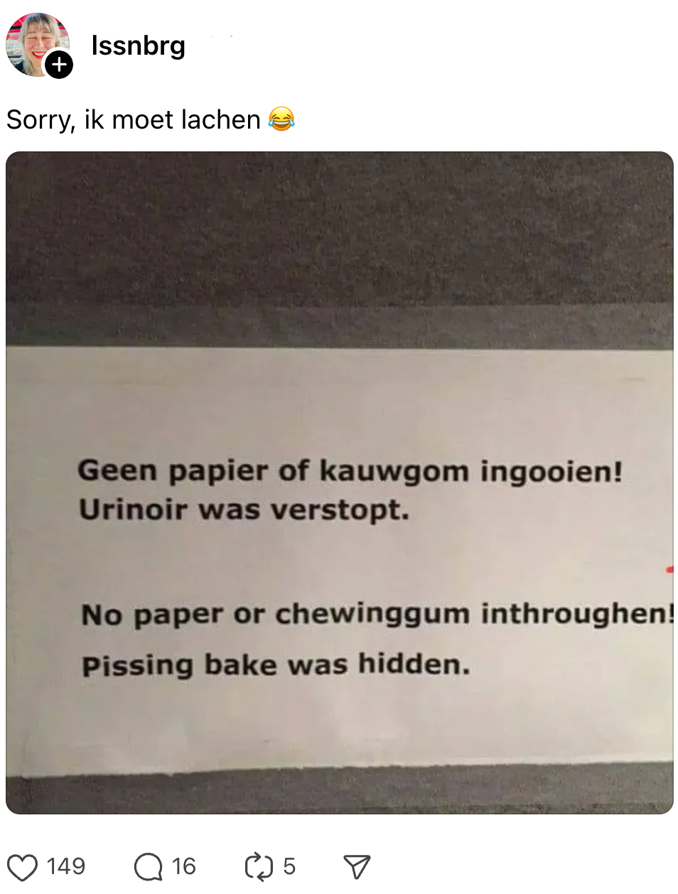 Als de nood hoog is, kun je nog maar aan één ding denken: het toilet. Het maakt dan niet uit of er een donkerbruin remspoor in de pot zit, een mensonterende lucht in dat schijtpaleis hangt, of het wc-papier op is – die blaas móét gewoon geleegd worden. Het enige wat de pret nog kan verpesten, is een wachtrij van hier tot Tokio. En het briefje dat déze toiletgebruiker spot wanneer ze naar binnen wil lopen. Hierdoor plas je niet alleen in je broek omdat de nood hoog is, maar ook van het lachen.’
