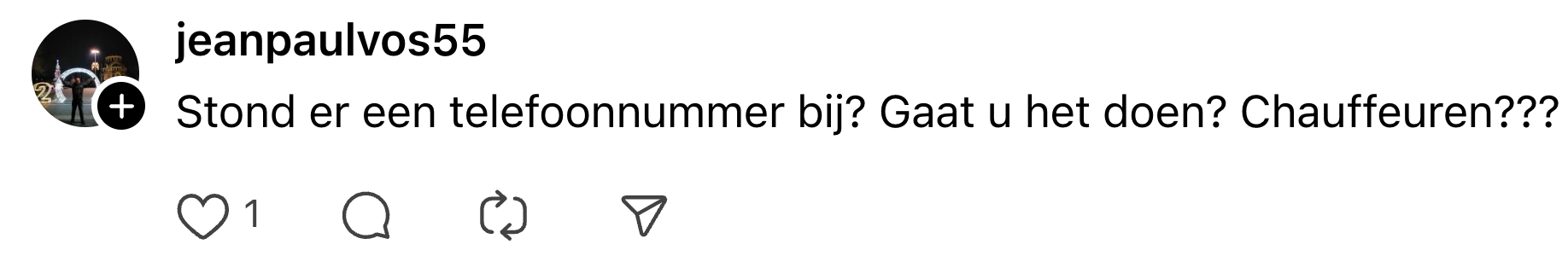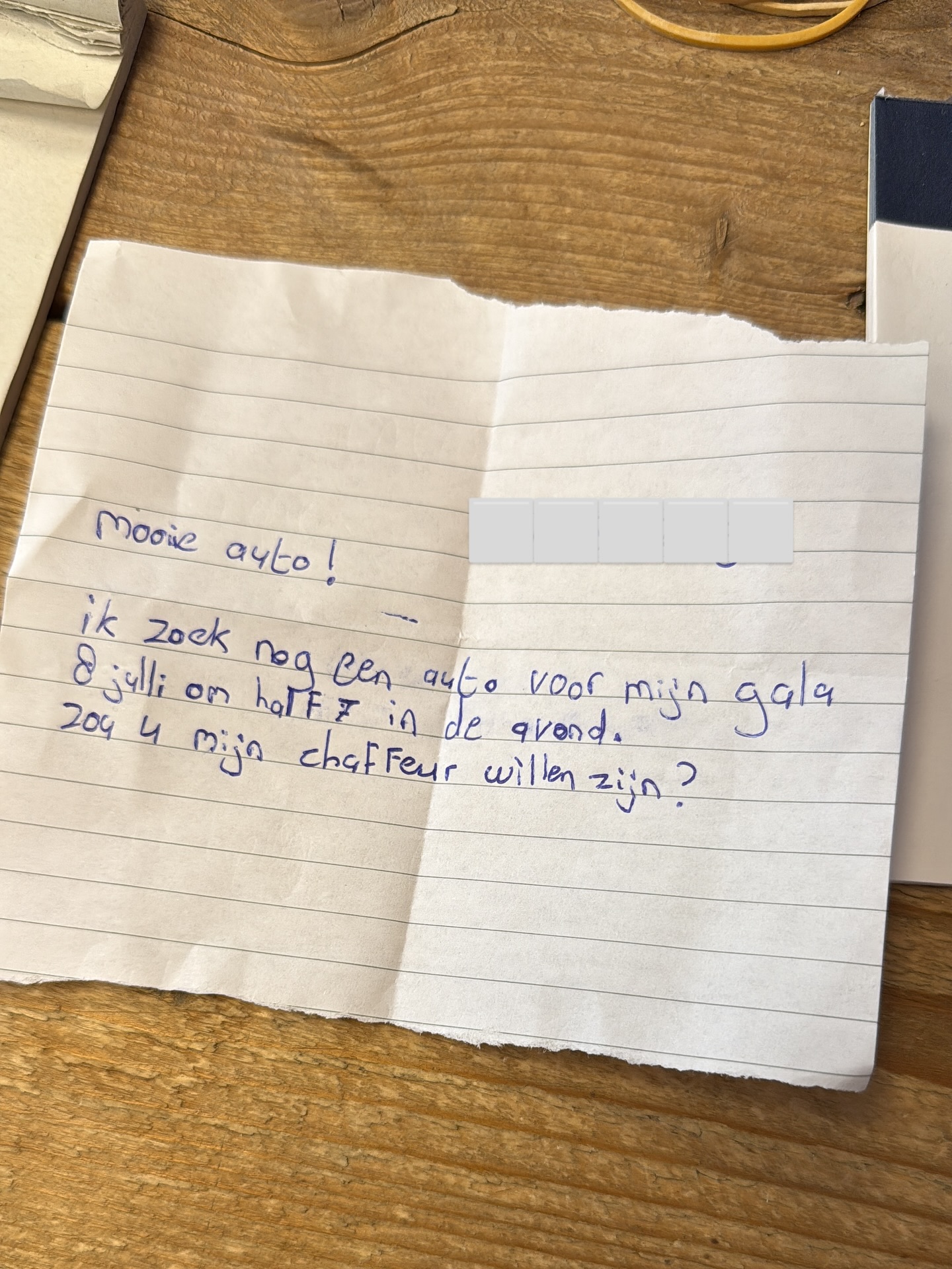 7. Helaas: de schrijver van dit briefje moet een ander vervoersmiddel zien te regelen voor het gala.