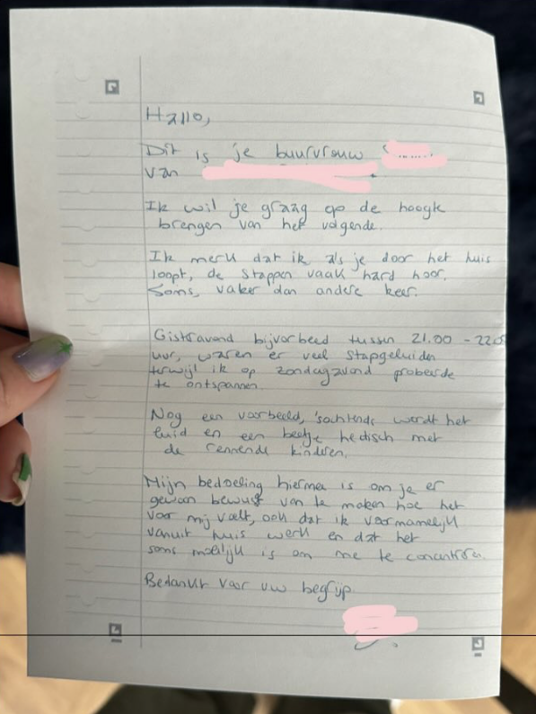1. Kiki deelt een briefje van een nieuwe, tot dan toe onbekende onderbuurvrouw, die klaagt over geluidsoverlast.