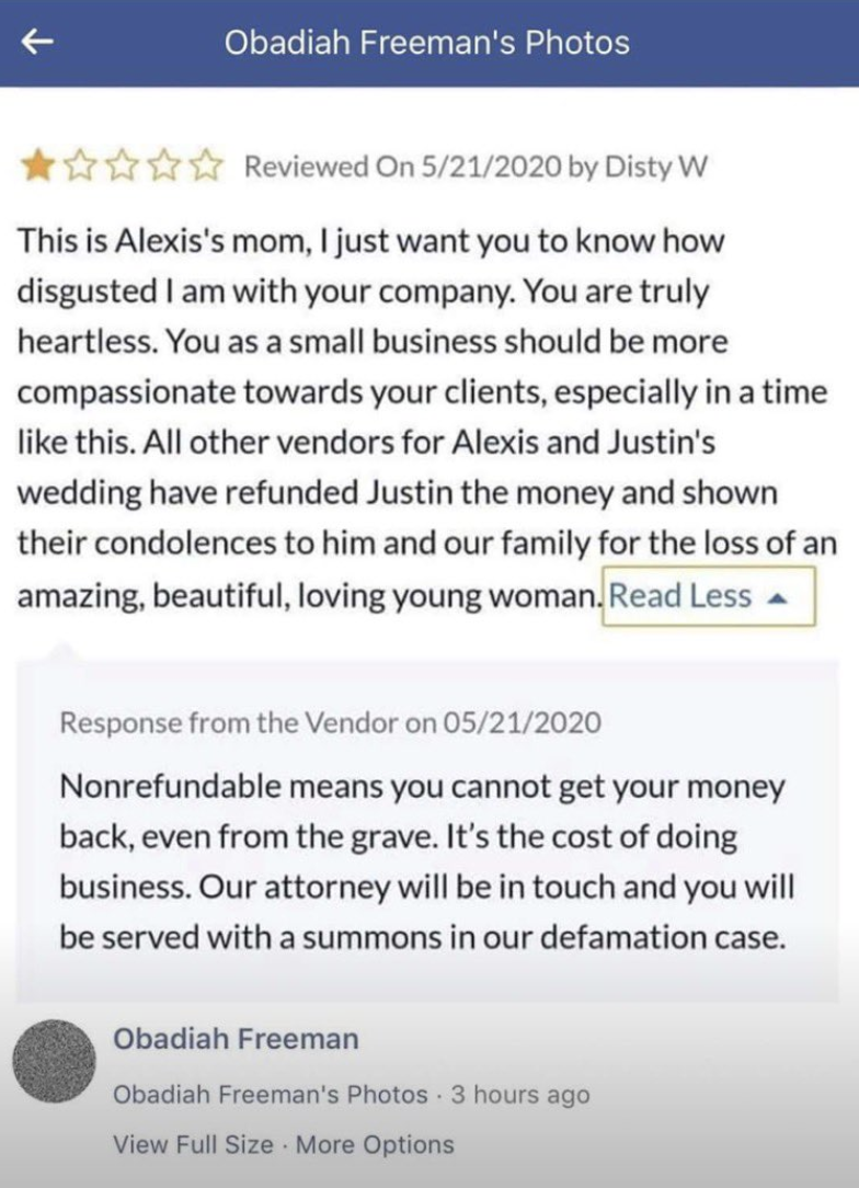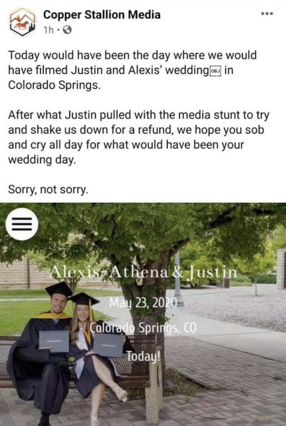 Justin en zijn verloofde hadden een videograaf ingehuurd. Wel hebben ze een contract getekend waar duidelijk in vermeld stond dat zij geen geld terug zouden krijgen. Toch hebben zij meer dan 1.800 euro betaald aan het bedrijf en vond hij dit een wel heel uitzonderlijke situatie. Na meerdere verzoeken weigerde het bedrijf nog steeds het geld terug te betalen. Ze dreigden zelfs een rechtszaak aan te spannen. In de tussentijd plaatsten zij dit bericht over Justin.