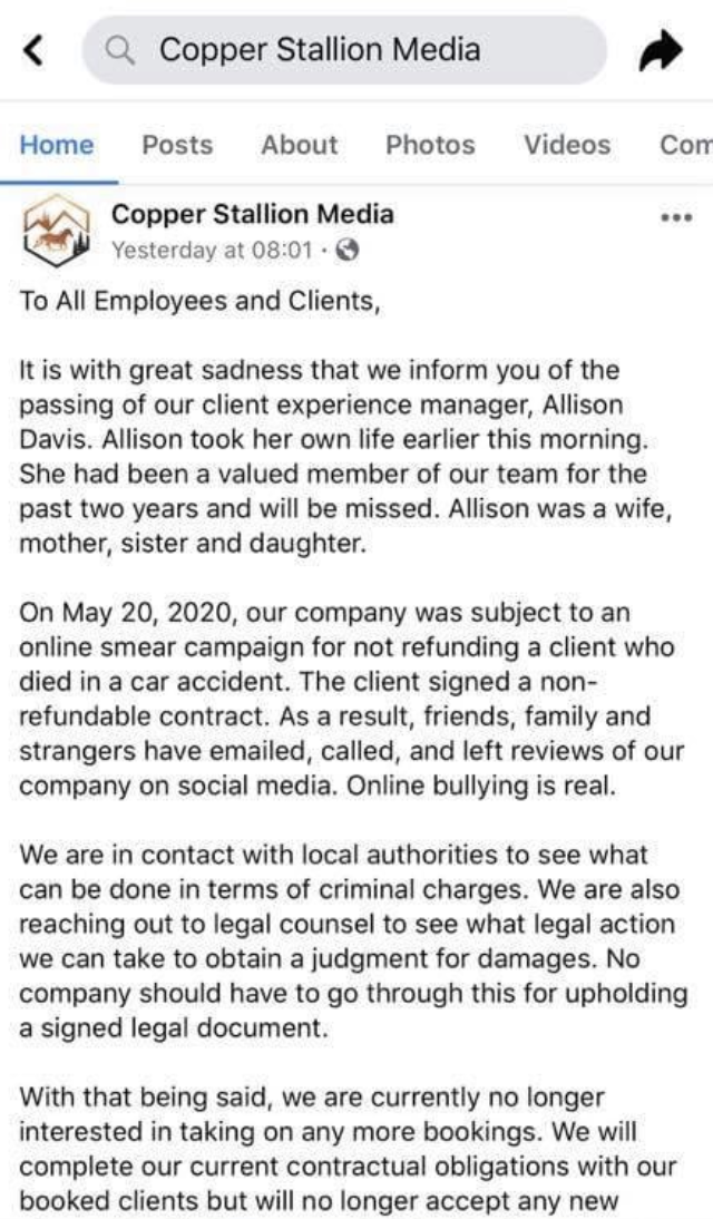Dude.. I read through the thread and that company posted that their employee killed herself due to the “cyber bullying” surrounding this situation.. someone looked her up, she *actually* died two years ago.
