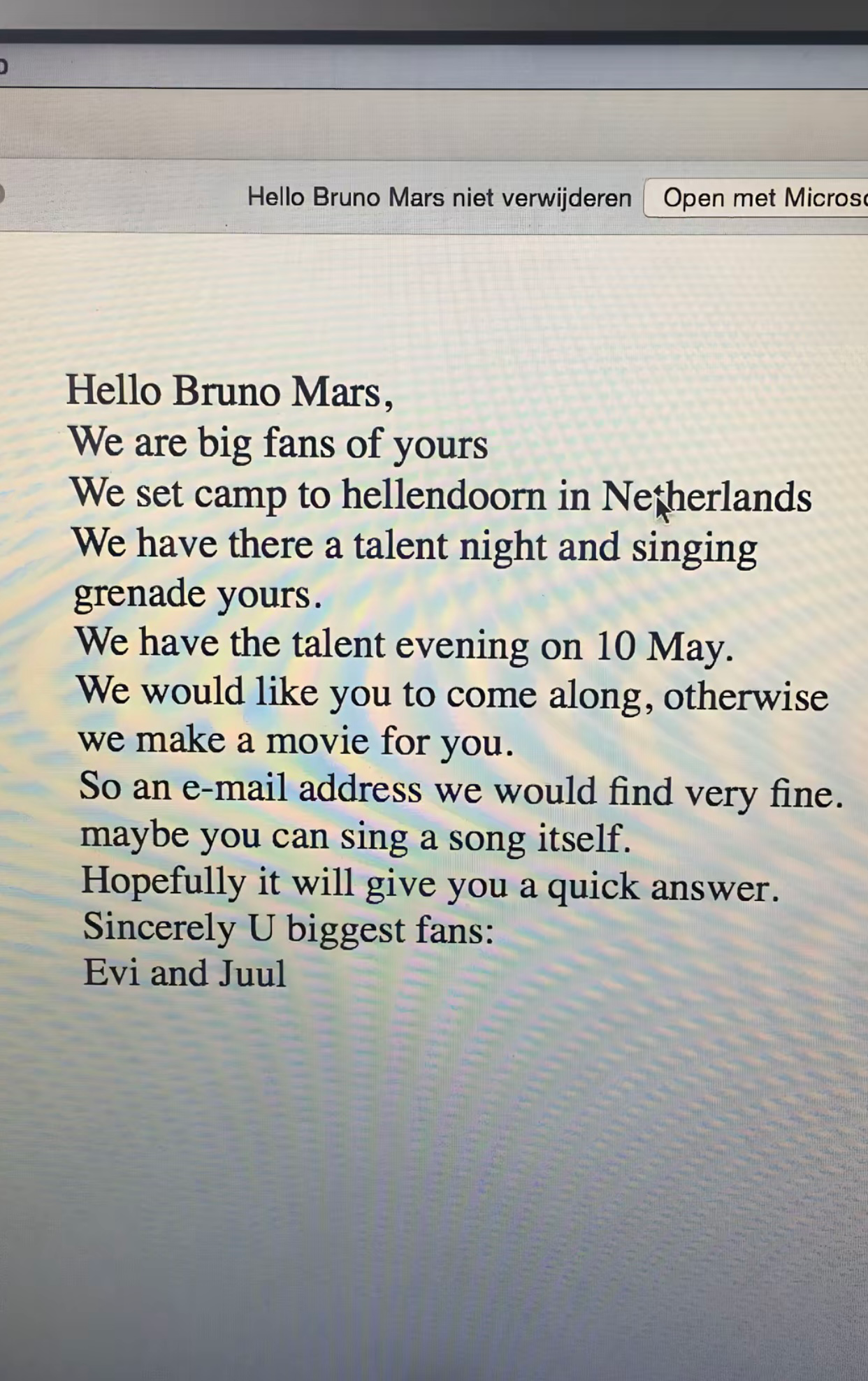 Het hoogtepunt van je basisschoolcarrière is niet goede cijfers halen of overgaan naar het volgende jaar, maar de eindmusical en het kamp in groep acht. Als het dan eenmaal zover was, wilde je natuurlijk alles uit de kast trekken om het onvergetelijk te maken. Ook Juul was van plan om iedereen omver te blazen tijdens haar optreden tijdens op de bonte avond. Zij wilde popster Bruno Mars vragen om te komen optreden en stuurde hem daarom een bijzonder mailtje.