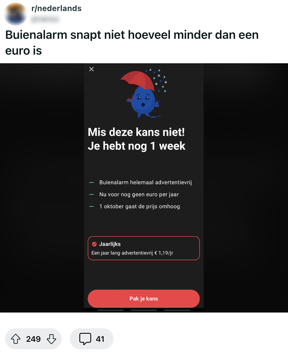 Buienalarm-gebruiker spot dubieuze melding in app en krijgt storm aan reacties