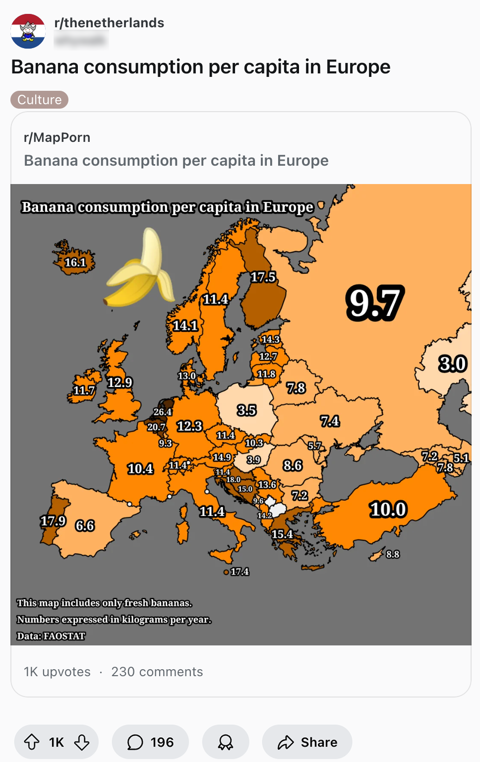 Diepgefrituurde snacks uit een muur trekken, de drang om Tikkies van vijftig cent te sturen, chaos in een Kruidvat en de beruchte Nederlandse g-klank. Pin ons er niet op vast, maar we denken dat deze dingen bij menig buitenlander op het lijstje met vreemde dingen van de Nederlandse cultuur staan. Vanaf vandaag kunnen ze daar nóg iets aan toevoegen: er is namelijk een kaart van Europa opgedoken waaruit blijkt dat wij in ons kikkerlandje bizar veel bananen per jaar wegwerken. En daarover kunnen we maar één ding zeggen: gaan met die banaan.