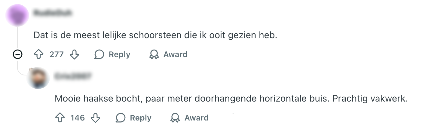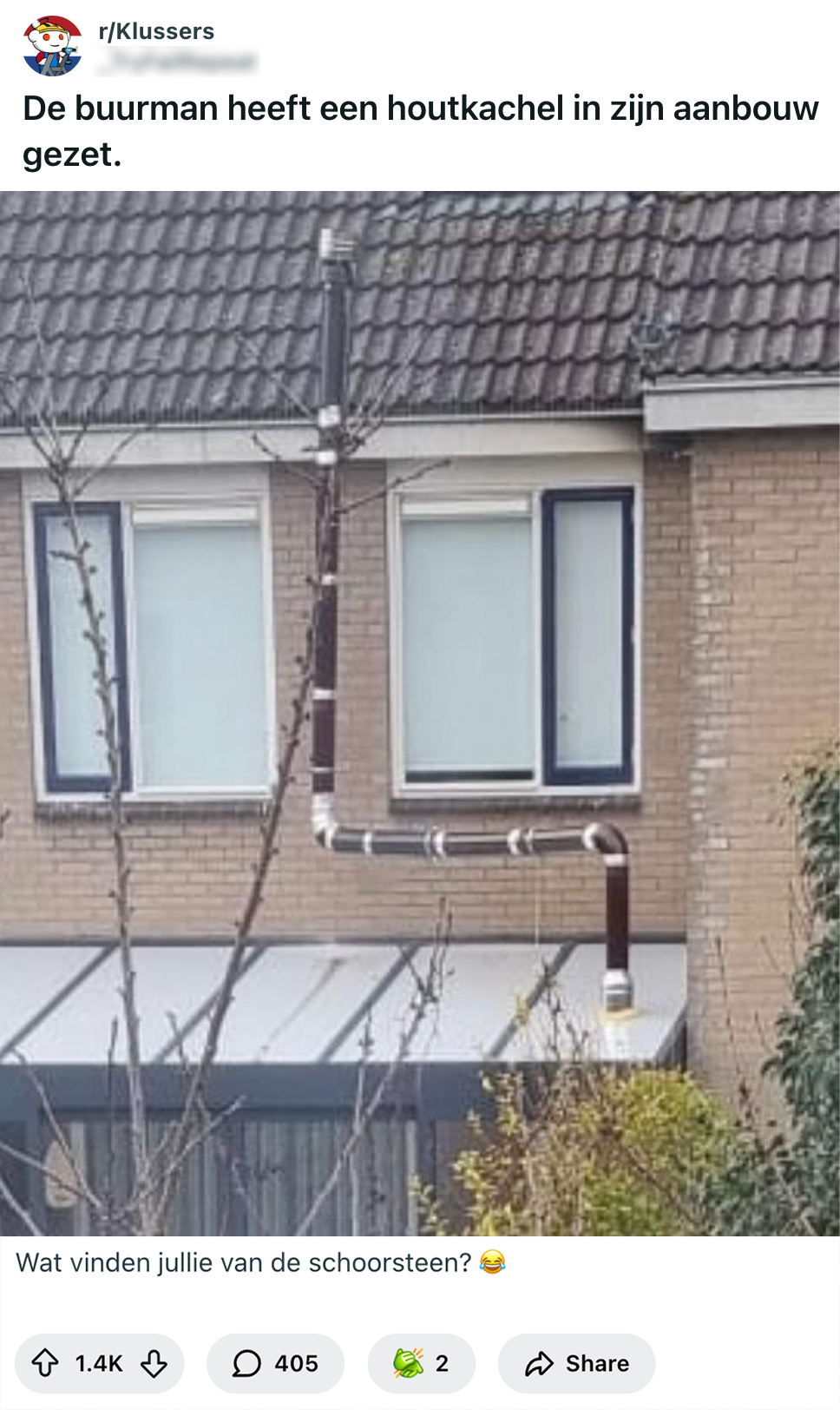 Zelf een PVC-vloer leggen, de wasbak vervangen of een regenton installeren – sommige doe-het-zelvers hebben het qua klussen in huis behoorlijk hoog in hun bol. Experts? Volstrekt overbodig, denken ze. Maar eindstand: alles staat schots en scheef en je mag alsnog een godsvermogen aftikken om die zogenaamd ‘overbodige’ vakmannen de boel te laten redden. Ook deze ‘klusser’ dacht beter te weten en installeerde zelf een schoorsteen op zijn aanbouw. Het resultaat is een gedrocht om te zien. Zij hebben er misschien geen last van, maar de buren wel – en precies daarom mogen de mensen van Reddit nu ook even meegenieten.
