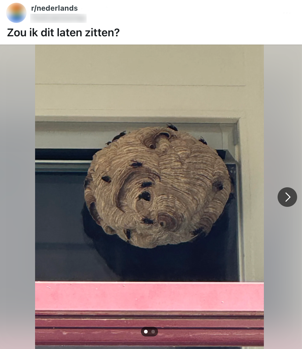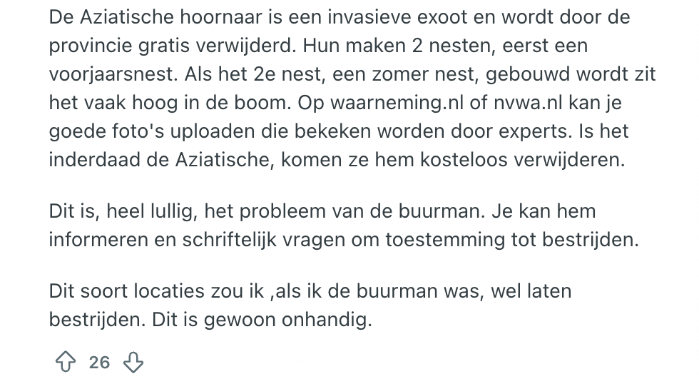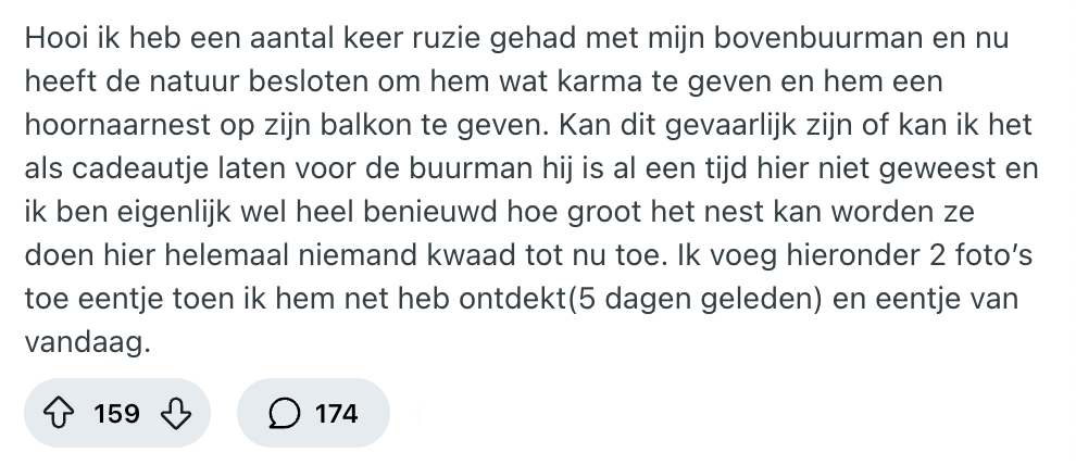 De één identificeert zich met Freek Vonk en is er helemaal weg van, maar de meesten slaken een keiharde gil als ze er één zien: insecten. Natuurlijk zijn er soorten die je best in de buurt kunt hebben, zoals een lieveheersbeestje. Maar lang niet alle insecten zijn even fijn om in je aura te hebben. Deze Reddit-gebruiker zit in een nogal lastig parket: hij heeft last van een boze buurman én er hangt een nest vol hoornaars op het balkon van die specifieke buurman. De bewoner vraagt andere Nederlanders om advies en gelukkig weten zij er wel raad mee.