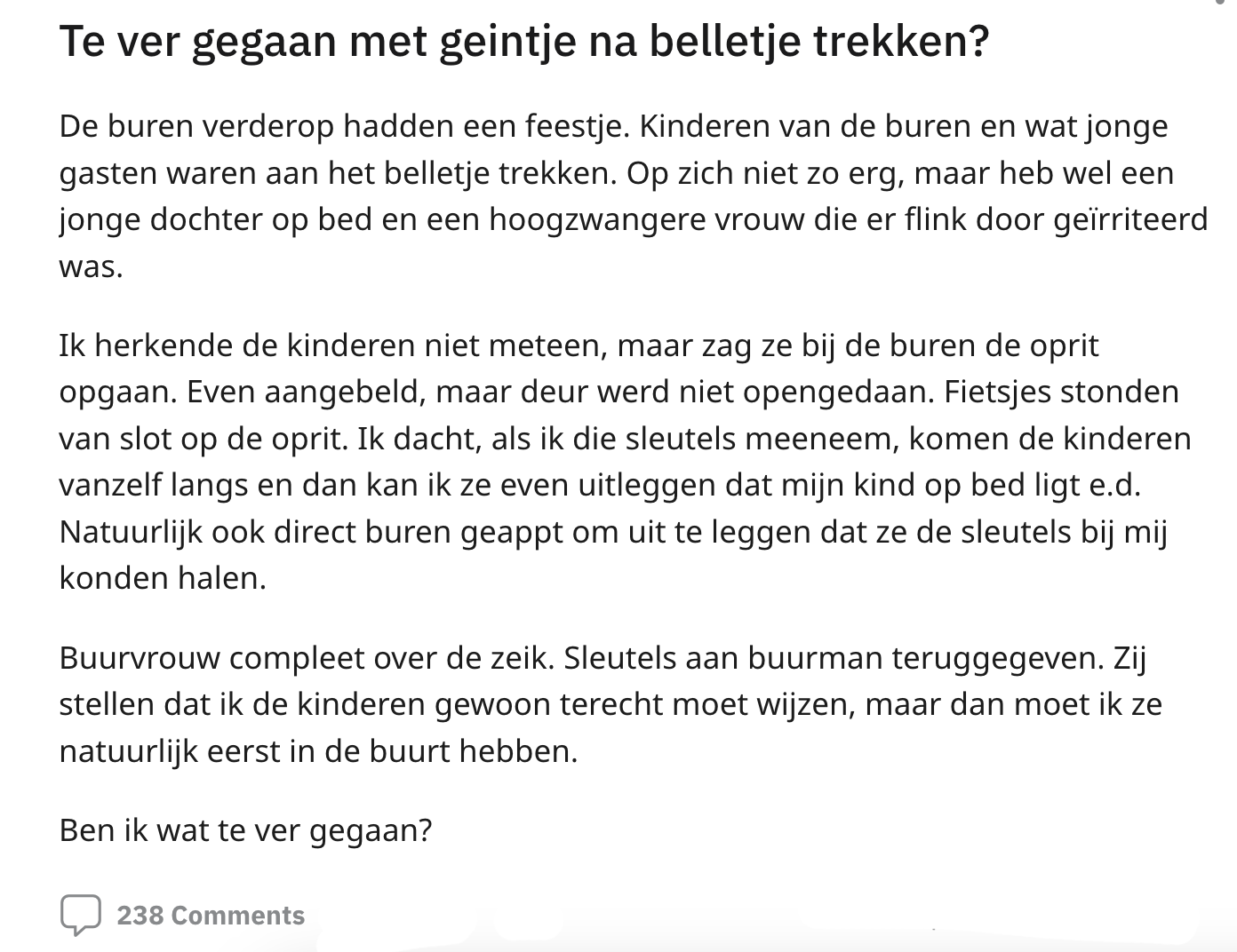 1. Op Reddit deelt de buurman zijn verhaal, omdat hij twijfelt over de manier waarop hij de situatie heeft aangepakt.
