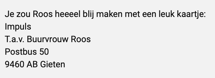 7. Als jij buurvrouw Roos nu ook een lach op haar gezicht wil bezorgen, schroom dan zeker niet om even een kaartje naar haar te sturen.