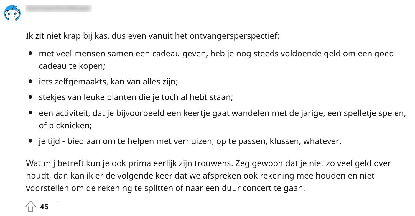 We hebben allemaal wel eens krap bij kas gezeten (of zitten dit nog steeds). Het kan dan best lastig zijn als je uitgenodigd wordt voor een verjaardag, maar eigenlijk geen budget hebt om een cadeau te kopen. Daarom werd op Reddit gevraagd naar inspiratie voor cadeaus als je niet zo veel te besteden hebt. Uit de reacties blijkt dat er genoeg opties zijn en dat je met creativiteit vaak al een heel eind komt.