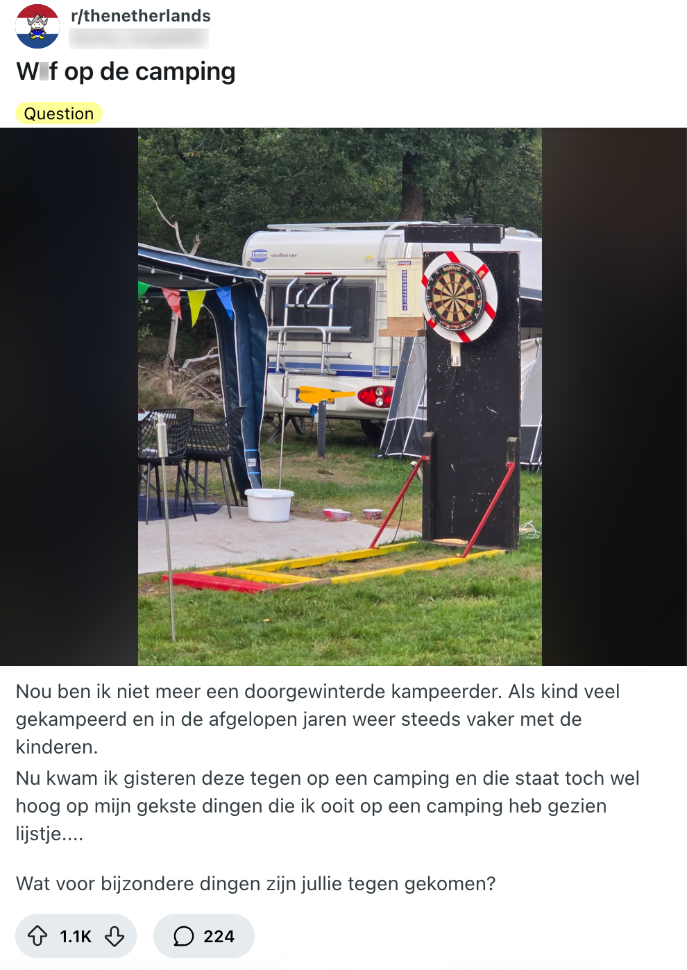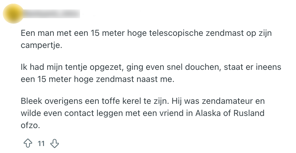 Als je over de camping loopt, kom je verschillende soorten kampeerders tegen. De een weet te overleven in het meest krakkemikkige tentje, terwijl de ander verblijft in een camper die nog groter is dan de gemiddelde studentenkamer. Maar daar blijft het niet bij. Wanneer deze Reddit-gebruiker over de camping loopt, komt-ie een installatie tegen die nogal opvalt. Andere Nederlanders reageren met de meest bizarre dingen die zij op de camping hebben gezien en hun verhalen zijn een schot in de roos.