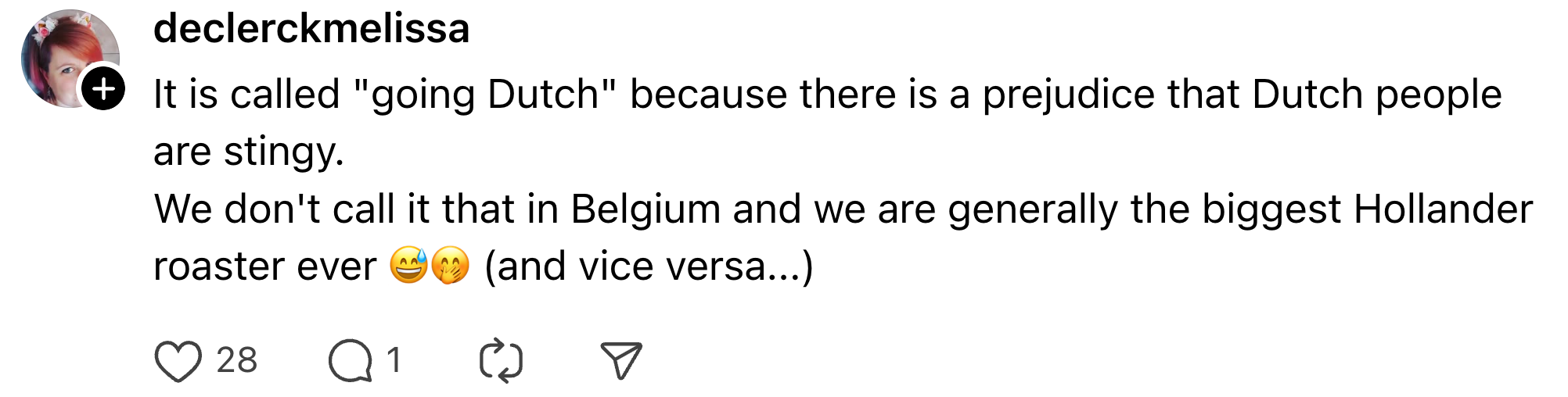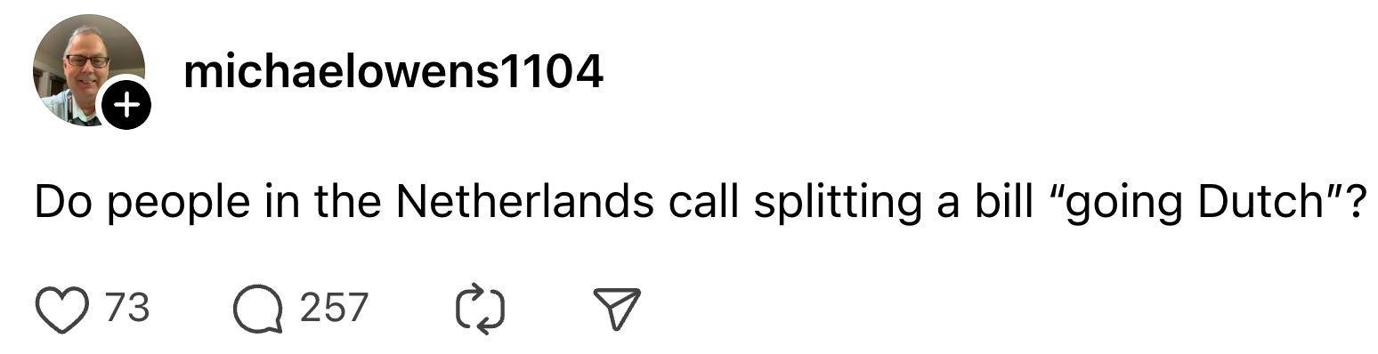 Nederlanders staan over het algemeen bekend als een vrij gierig volk. Niet voor niets wordt het splitten van de rekening in het buitenland dan ook ‘going Dutch’ genoemd. We staan er weer goed op. Toch vraagt een Canadees zich af hoe we dat dan in het Nederlands noemen — en dat levert uitmuntende antwoorden op.