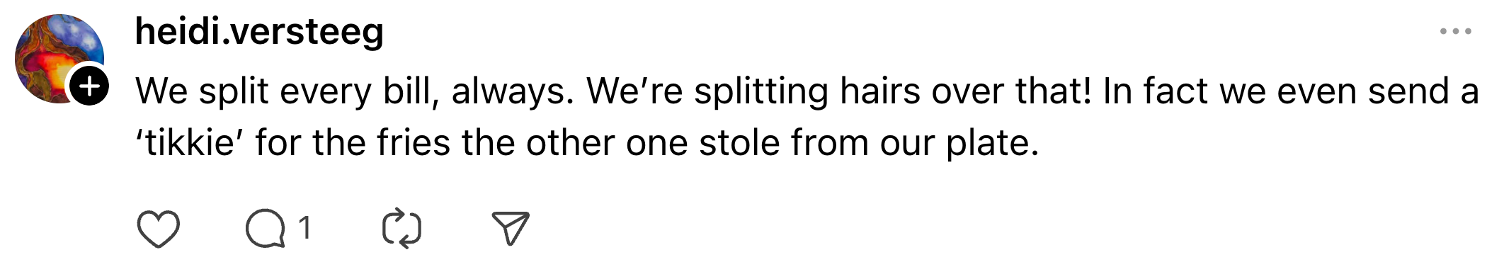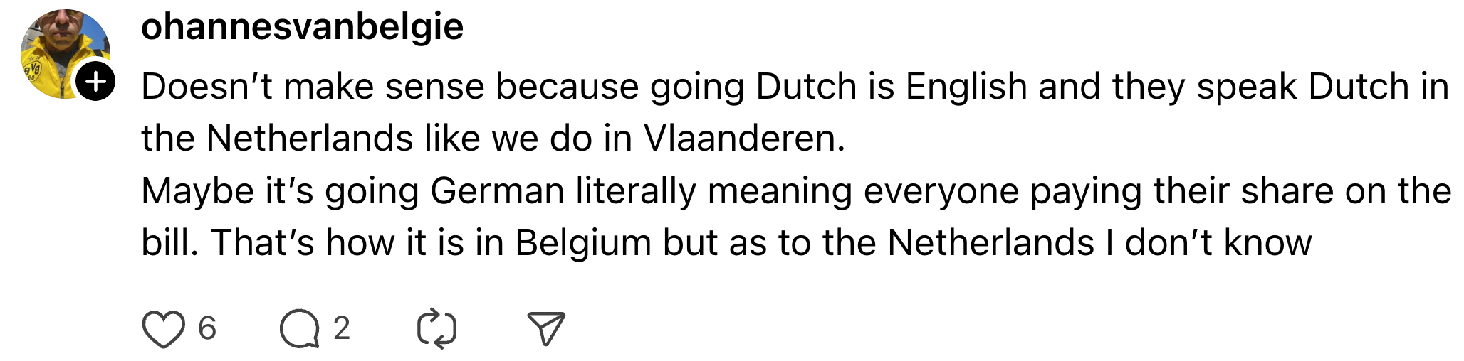 Nederlanders staan over het algemeen bekend als een vrij gierig volk. Niet voor niets wordt het splitten van de rekening in het buitenland dan ook ‘going Dutch’ genoemd. We staan er weer goed op. Toch vraagt een Canadees zich af hoe we dat dan in het Nederlands noemen — en dat levert uitmuntende antwoorden op.