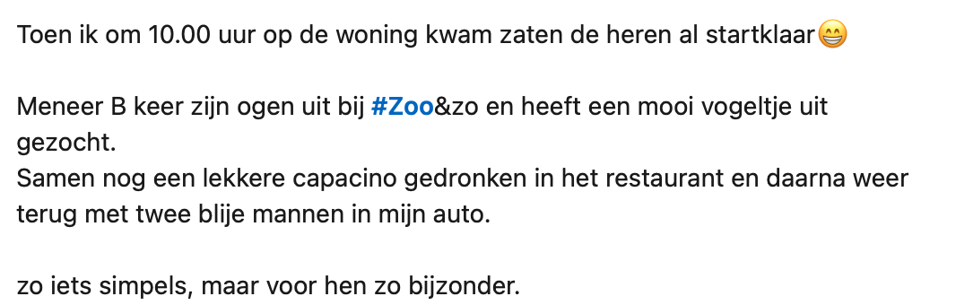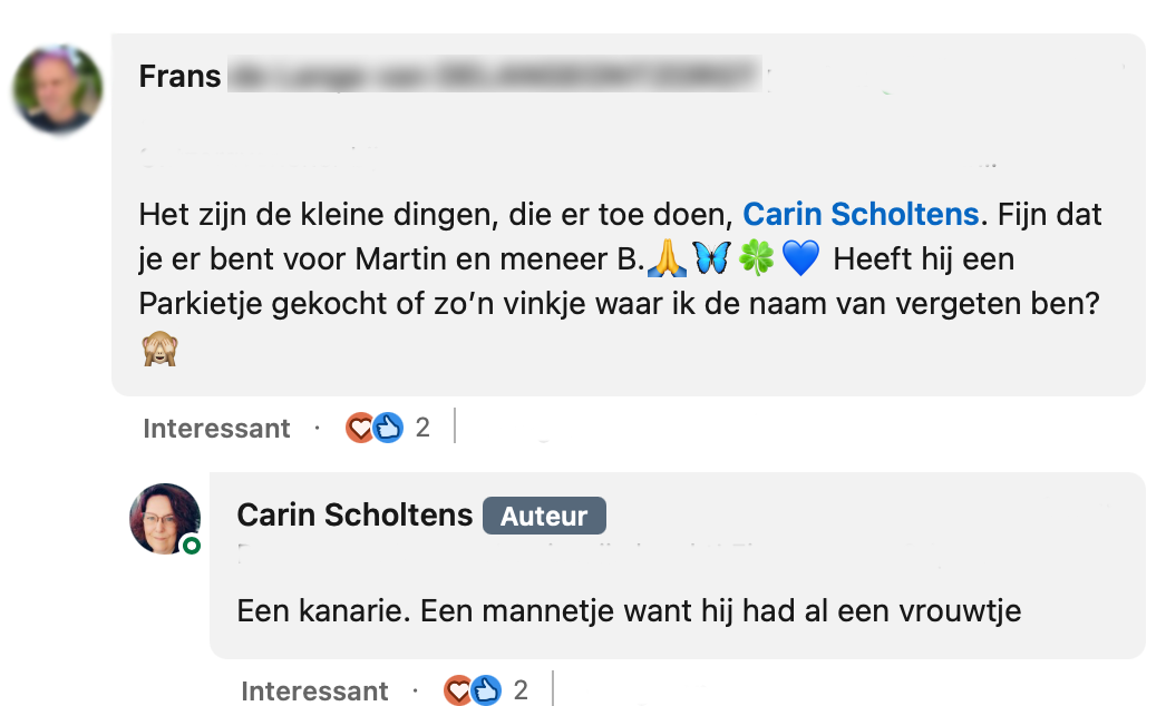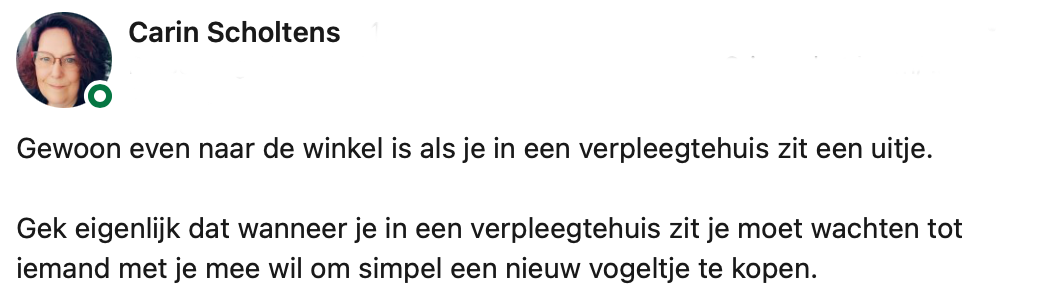 Geluk zit vaak in de kleine dingen. Dat blijkt wel uit het bericht dat Carin deelt op LinkedIn. Soms kun je met een klein gebaar iemands dag volledig maken. Wanneer Carin in gesprek raakt met een van de bewoners in het verzorgingstehuis van haar man, vertelt hij dat hij eigenlijk zo graag een nieuw vogeltje zou willen. Er is alleen niemand die tijd heeft om met hem mee te gaan naar een winkel. Carin laat zich dit niet twee keer zeggen en besluit actie te ondernemen.