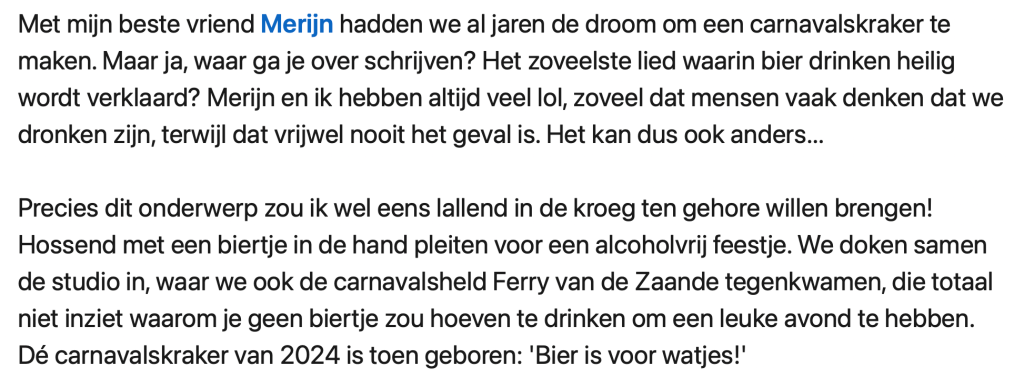 2. Hij besluit de handen ineen te slaan met goede vriend Merijn en het thema aan te kaarten in een carnavalsnummer.