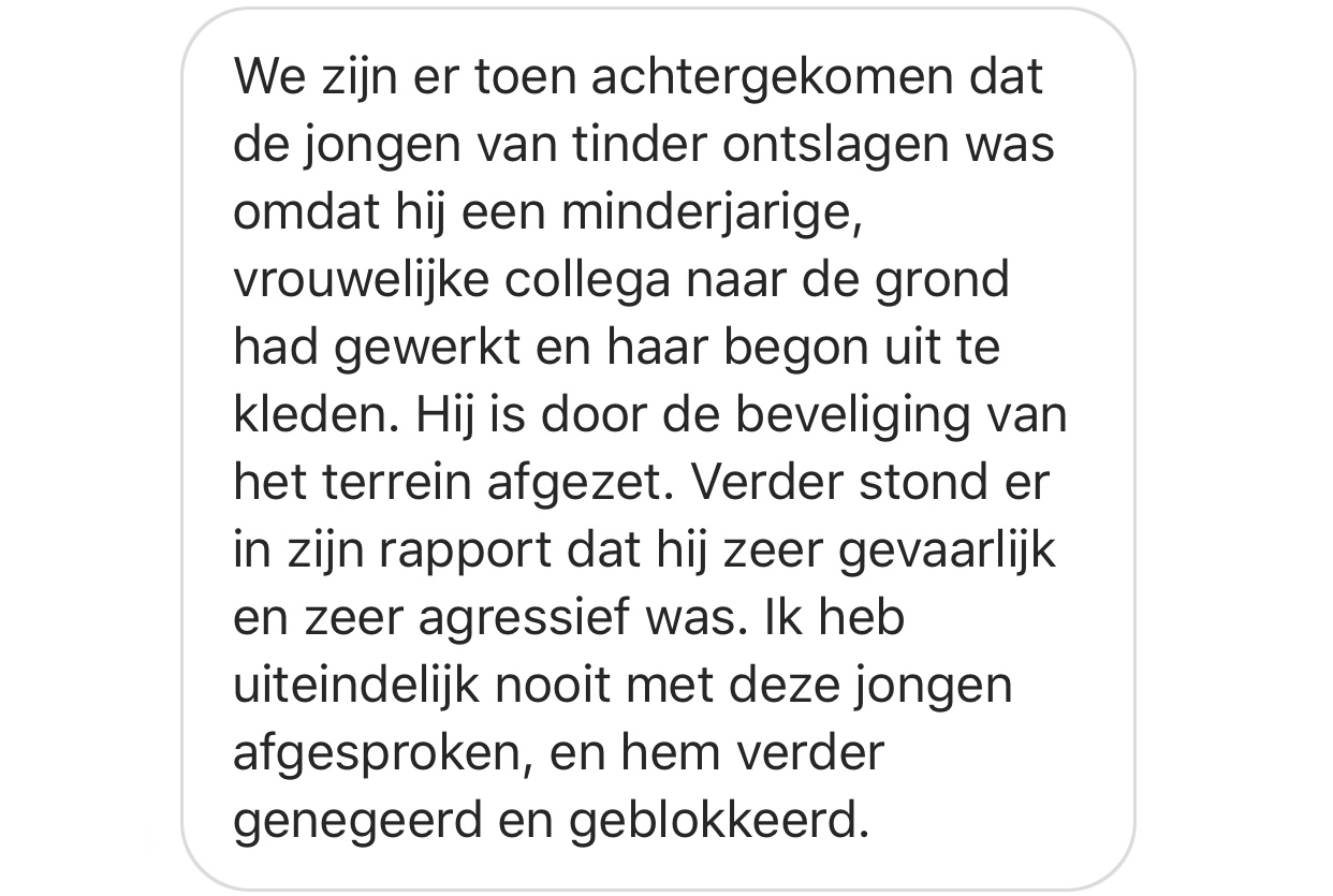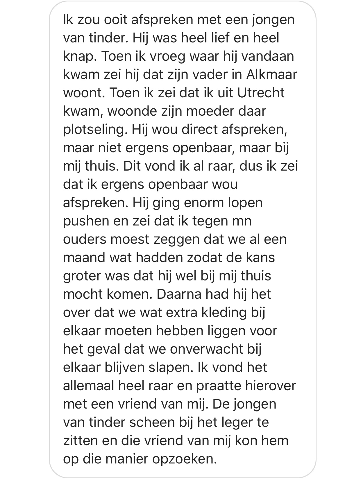 7. Ten slotte dit enge verhaal van een meisje en haar Tinder match. Hoewel het in eerste instantie goed klikte, deed de jongen erg opdringerig en wilde hij meteen bij het meisje thuis afspreken.