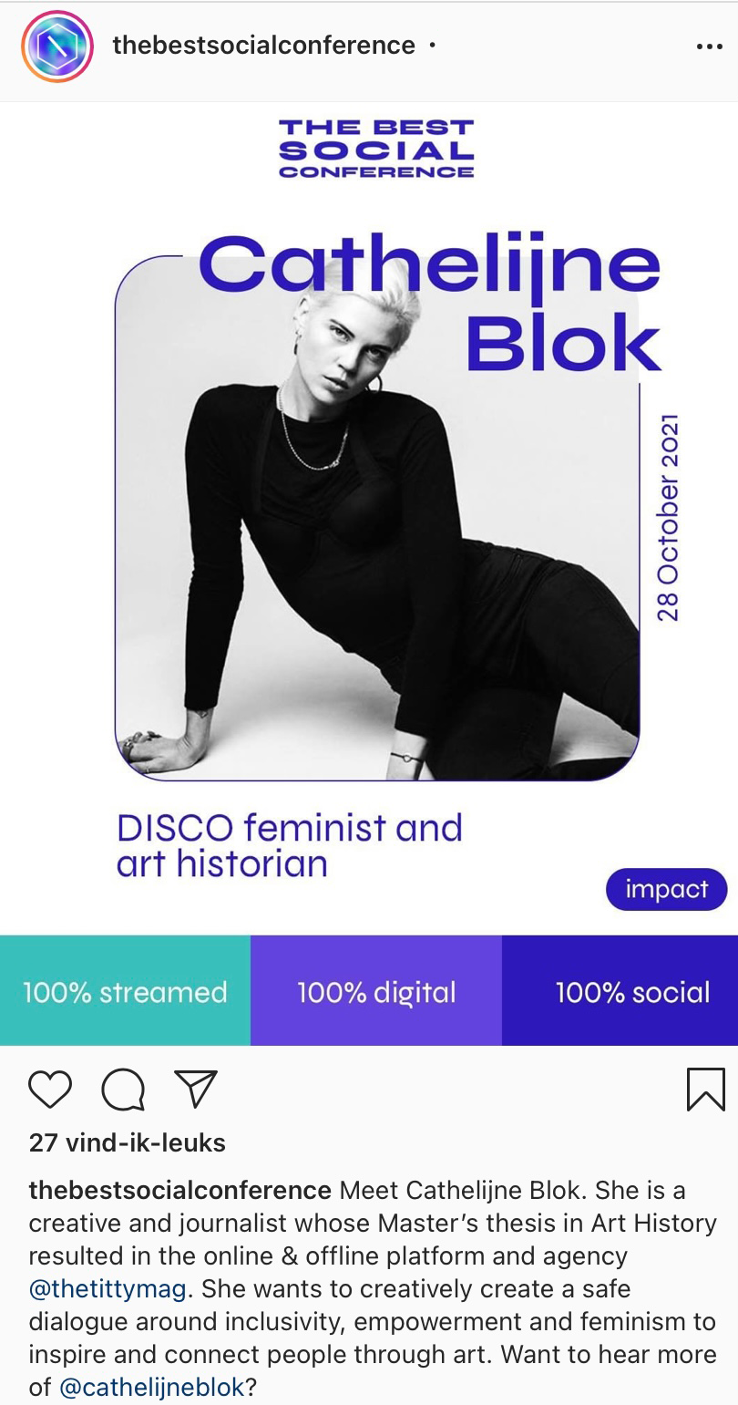 Cathelijne Blok is creative, journalist en oprichter van het feministische kunstplatform en bureau TheTittyMag. Online en offline voert het team van The TittyMag het dialoog rondom inclusiviteit, empowerment en feminisme. Op social media doen ze dit onder andere door het delen van inspirerende kunst van vrouwen, die voor meer kleur op je tijdlijn zorgen. Laat Cathelijne nou net binnenkort een talk geven tijdens The Best Social Conference. Maar daarover later meer.