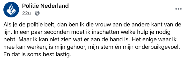 1. Dit is het bericht van Marion, dat Politie Nederland onlangs op Facebook plaatste. Ze vertelt dat het werk als centralist best lastig kan zijn.