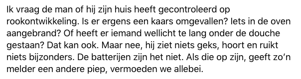 4. Ook schiet koolmonoxide door haar hoofd en daar moet natuurlijk naar gevraagd worden. Maar dan begint het alarm plots weer te loeien.