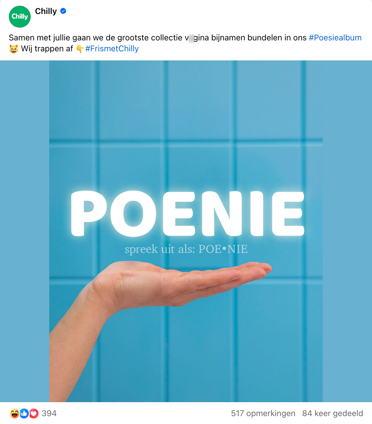 De Nederlandse taal kent best veel alternatieve namen voor hetgeen dat je in je broek hebt zitten. Toch ontdekken we om de haverklap weer nieuwe varianten. En laten we eerlijk zijn: negen van de tien keer zijn die allesbehalve fraai. Van vleesvlinder tot pielemuis: de complete dierentuin wordt erbij gehaald. Chilly vraagt op Facebook naar nóg meer creatieve bijnamen voor de intieme zone van vrouwen, en in de reacties worden aardig wat hoogtepunten bereikt.