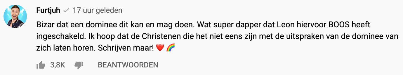 Veel ophef op social media rond een aflevering van de online serie BOOS van gisteren. De homoseksuele Leon belde het programma omdat hij boos is op zijn oude kerk in Krimpen aan de Ijssel. Hier is hij, vanwege zijn geaardheid, van verbannen en de dominee wil het gesprek niet aangaan. En daarom komt Tim Hofman ‘even’ langs om dit te regelen. Dat de mensen van de kerk niet van dit bezoekje gediend zijn, wordt al snel duidelijk. Wanneer meerdere leden van de kerk Leon en de BOOS-crew bedreigen, zijn ze genoodzaakt te vluchten. Leon zit er hierna mentaal even helemaal doorheen, maar kan vanuit de christelijke wereld achteraf op vele hartverwarmende berichtjes rekenen.