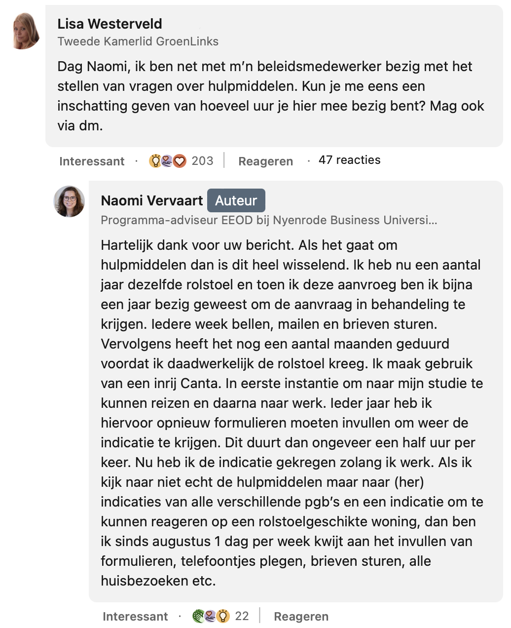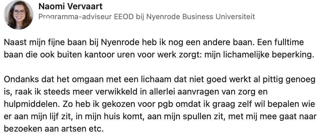 Naomi Vervaart is erg blij met haar baan bij Nyenrode, maar helaas houdt ze daarna weinig tijd over voor echte vrije tijd. Zelf omschrijft ze haar lichamelijke beperking in een LinkedIn-bericht als een extra fulltime baan. Naomi heeft een chronische ziekte waardoor ze in een rolstoel zit. In Nederland zijn er gelukkig veel hulpmiddelen en zorg voor mensen met een chronische ziekte. Helaas is het wel zo dat het veel tijd kost voor chronisch zieke mensen om al deze hulpmiddelen en zorg te behouden. Naomi schreef er een belangrijk bericht over op LinkedIn en wij willen dit graag met jullie delen.