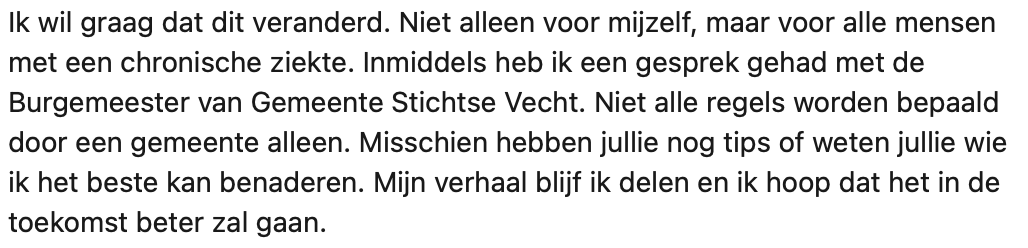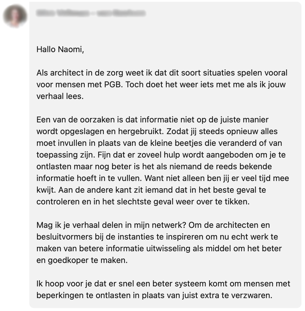8. Wij sluiten dit artikel af met een reactie van iemand die Naomi graag wil helpen en anderen wil inspireren. Dat is ook onze boodschap. We hopen dat Naomi’s verhaal nog veel aandacht zal krijgen, zodat de levens van mensen met een chronische ziekte niet lastiger gemaakt worden door alle administratieve rompslomp.