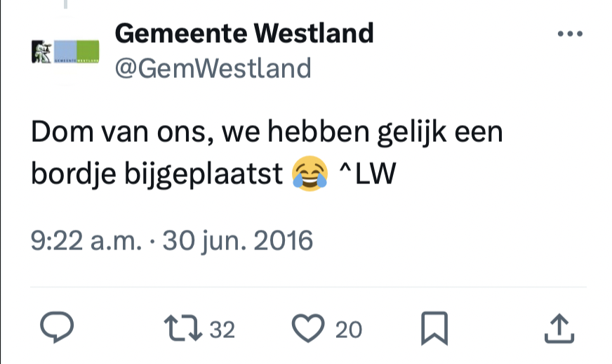 9. Een inwoner van de gemeente Westland vindt dit opvallende bord een beetje te hoog hangen en daar gaan ze bij de gemeente meteen mee aan de slag.