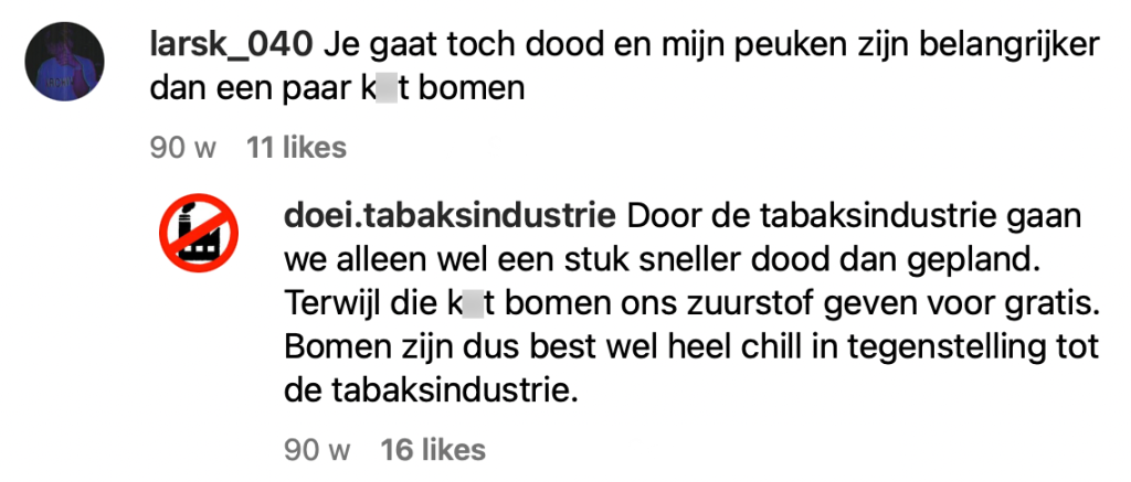 7. Het account Doeitabaksindustrie laat zien dat zij zonder filter reageren op bekrompen comments.