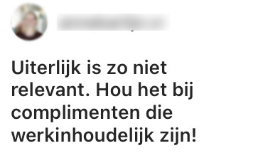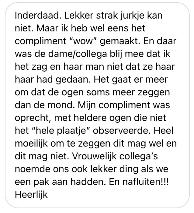 Aan de hand van een eerder artikel, vroegen we hoe jullie denken over complimenten op de werkvloer. Jullie deelden massaal waar jullie grens ligt. De afgelopen weken hebben aan de hand van de aflevering van BOOS veel gesprekken plaatsgevonden over seksuele intimidatie door collega’s en werkgevers. Is het beter om elkaar alleen nog vakinhoudelijke complimenten te geven, of moet een positieve opmerking over iemands uiterlijk ook gewoon kunnen? Bij welke opmerking ga jij op je strepen staan?